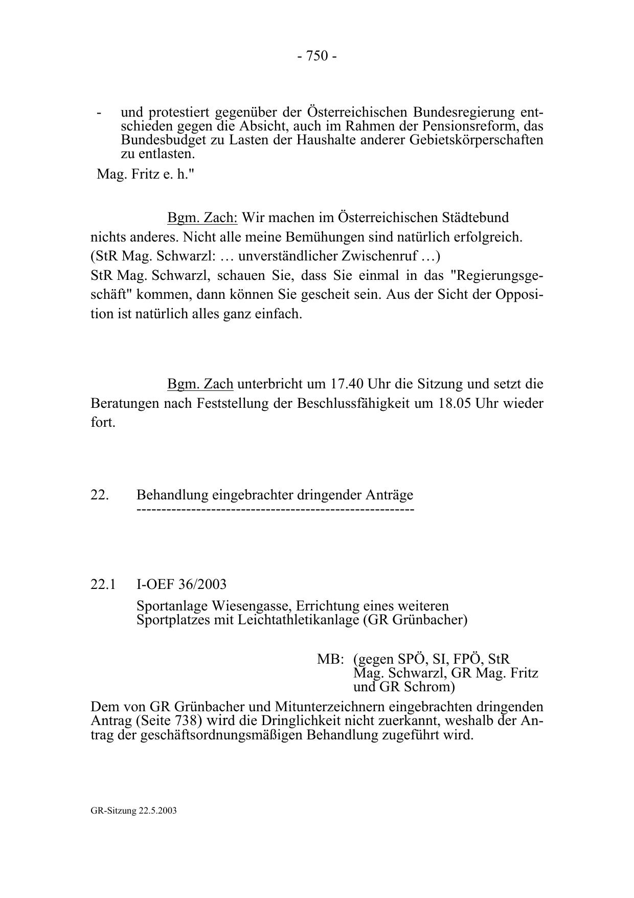 Bgm. Zach unterbricht um 17.40 Uhr die Sitzung und setzt die