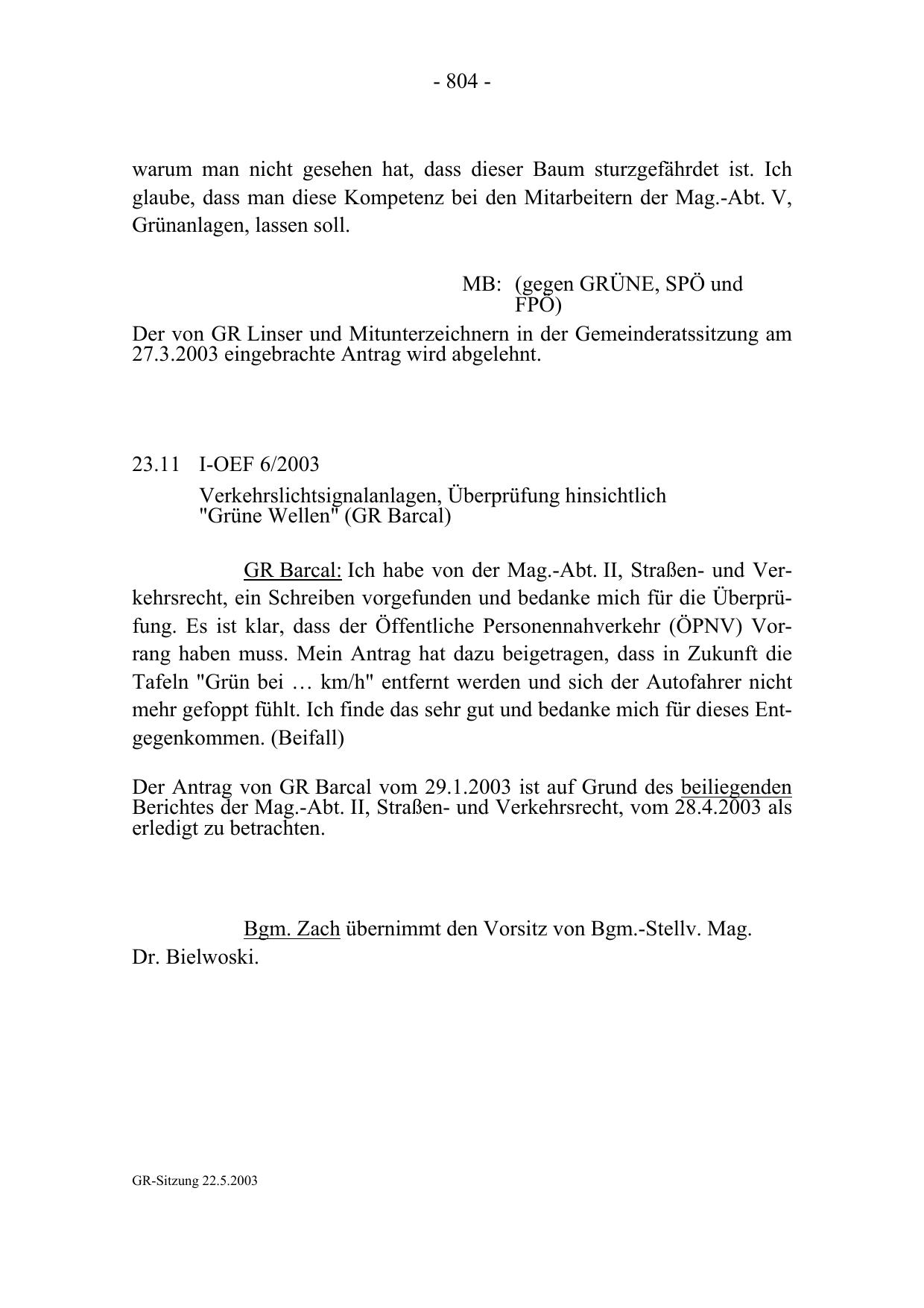 Berichtes der Mag.-Abt. II, Straßen- und Verkehrsrecht, vom 28.4.2003 als