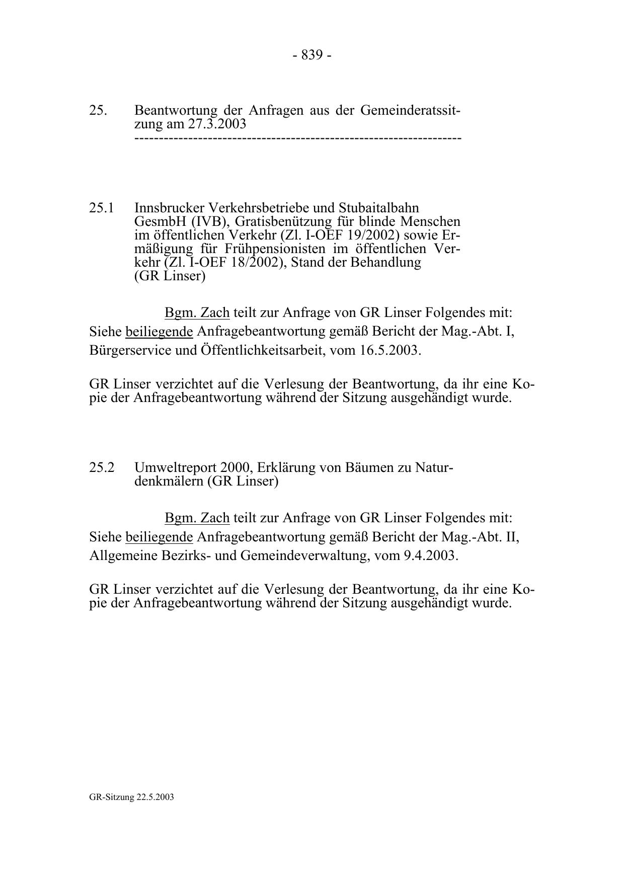 Beantwortung der Anfragen aus der Gemeinderatssitzung am 27.3.2003