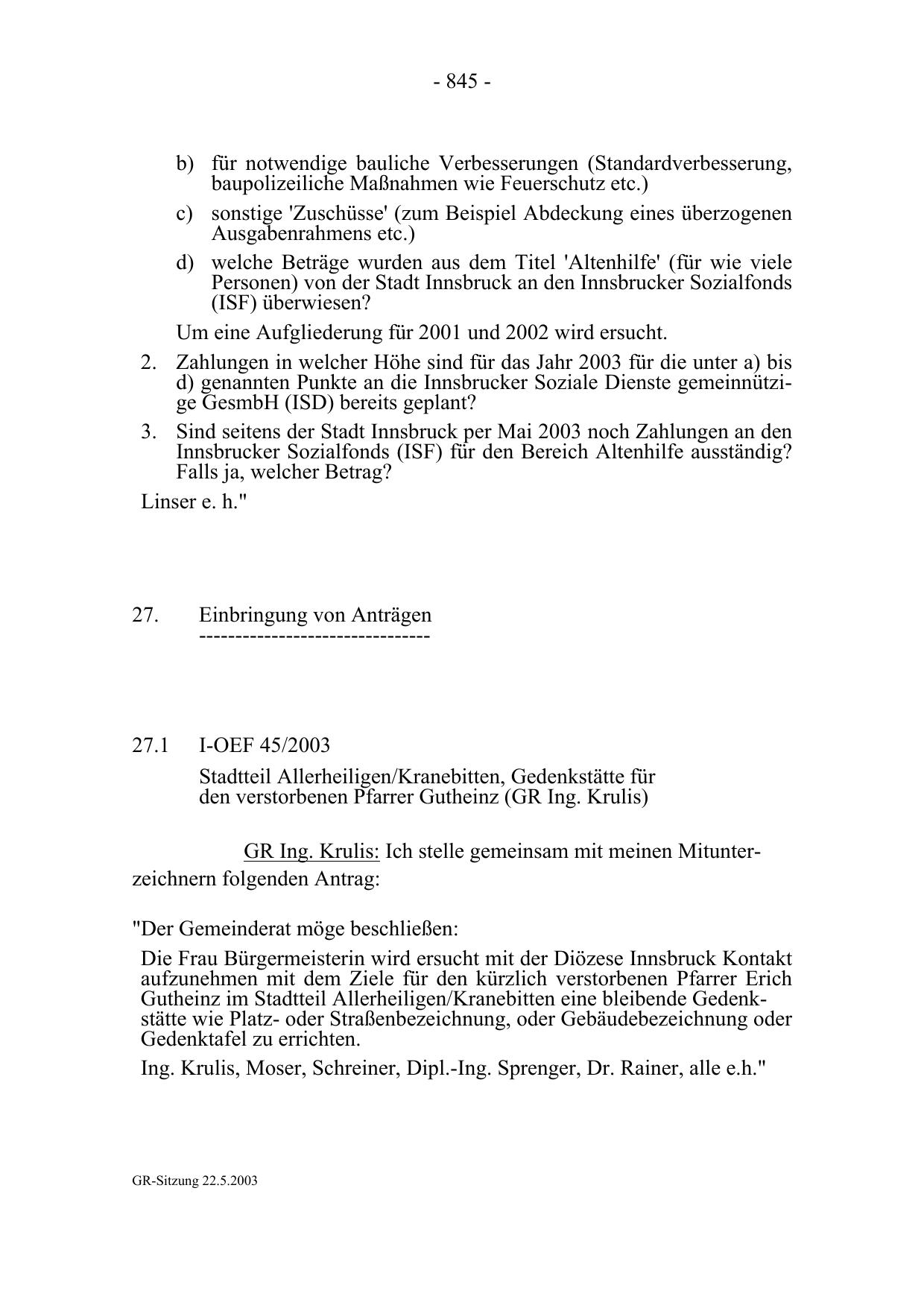3. Sind seitens der Stadt Innsbruck per Mai 2003 noch Zahlungen an den