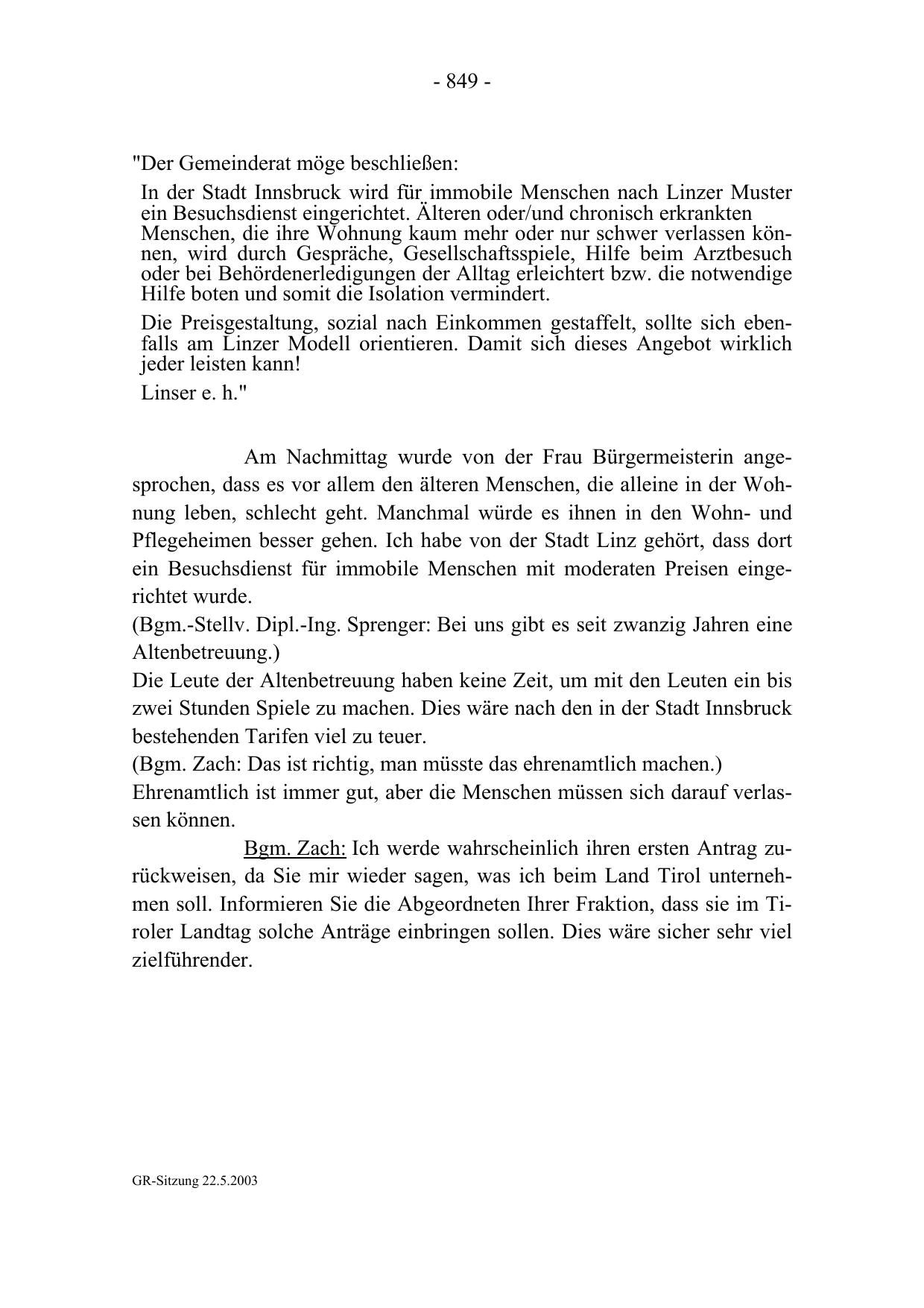 Bgm. Zach: Ich werde wahrscheinlich ihren ersten Antrag zurückweisen, da Sie mir wieder sagen, was ich beim Land Tirol unternehmen soll. Informieren Sie die Abgeordneten Ihrer Fraktion, dass sie im Tiroler Landtag solche Anträge einbringen sollen. Dies wäre sicher sehr viel
