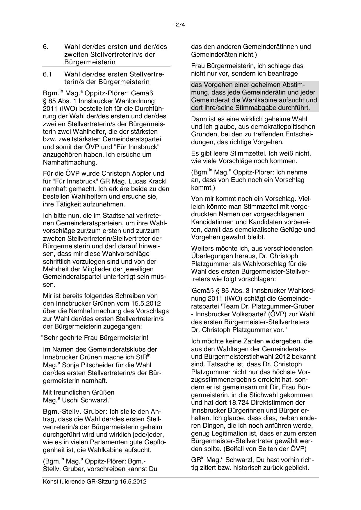 "Gemäß § 85 Abs. 3 Innsbrucker Wahlordnung 2011 (IWO) schlägt die Gemeinderatspartei "Team Dr. Platzgummer-Gruber