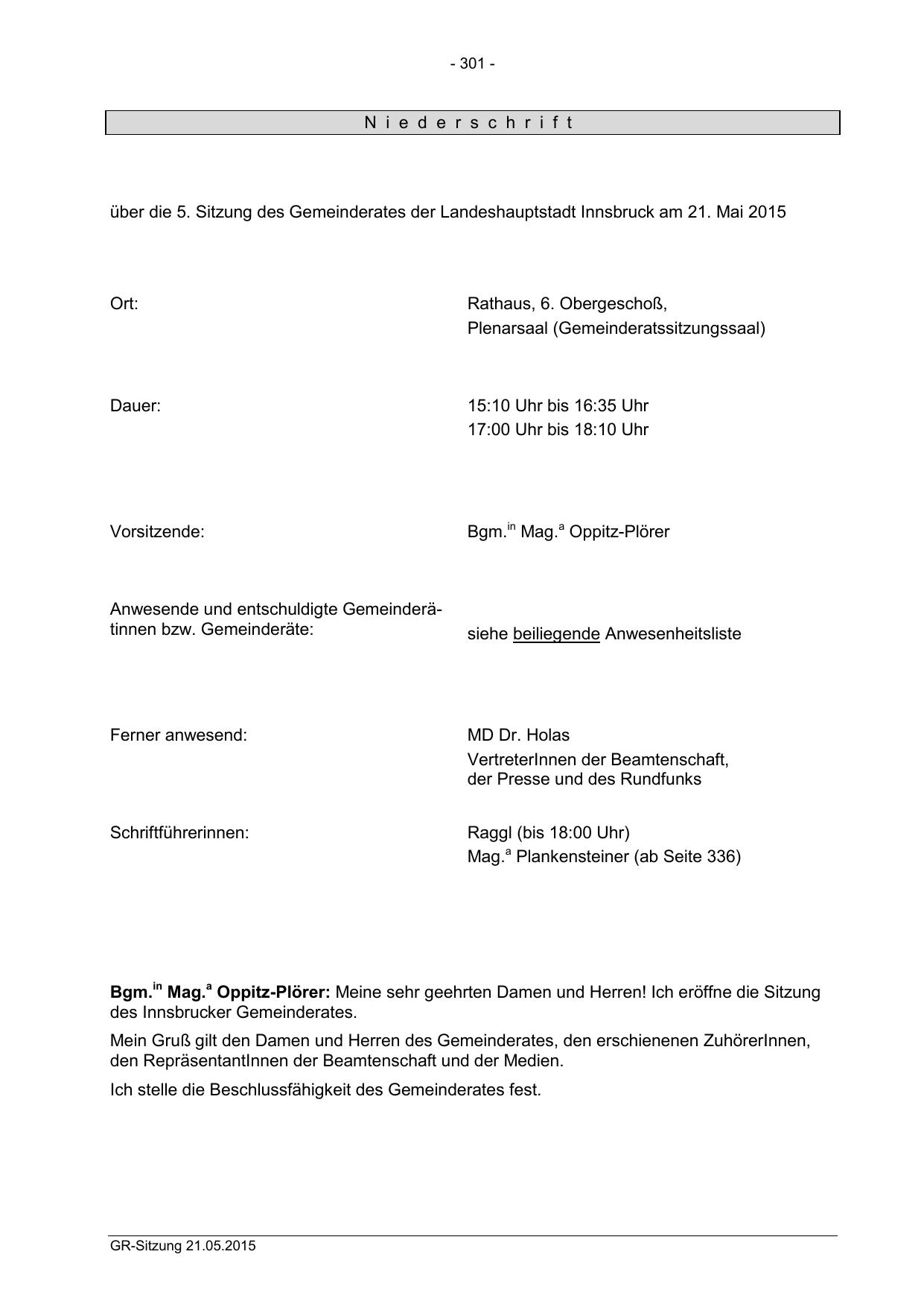 über die 5. Sitzung des Gemeinderates der Landeshauptstadt Innsbruck am 21. Mai 2015