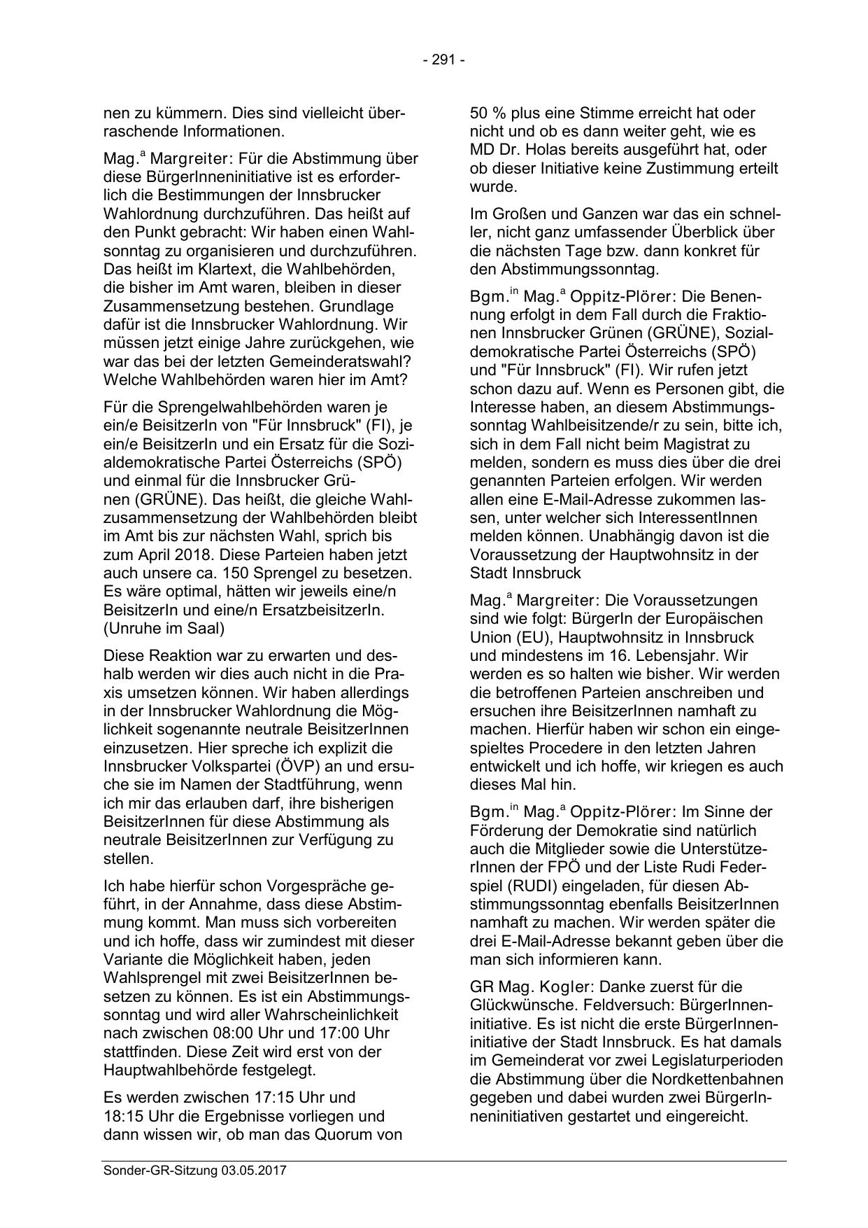 Bgm.in Mag.a Oppitz-Plörer: Die Benennung erfolgt in dem Fall durch die Fraktionen Innsbrucker Grünen (GRÜNE), Sozialdemokratische Partei Österreichs (SPÖ)