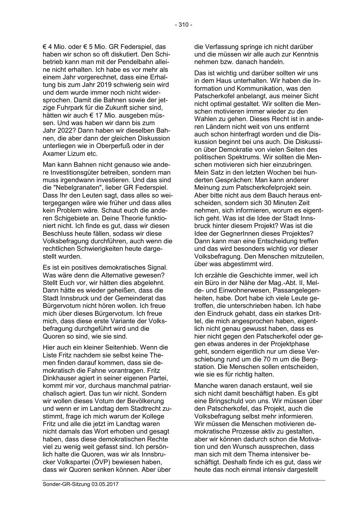 viel zu wenig weit gefasst sind. Ich persönlich halte die Quoren, was wir als Innsbrucker Volkspartei (ÖVP) bewiesen haben,