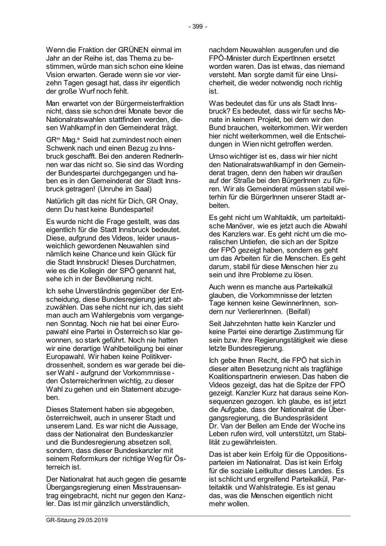 Schwenk nach und einen Bezug zu Innsbruck geschafft. Bei den anderen RednerInnen war das nicht so. Sie sind das Wording