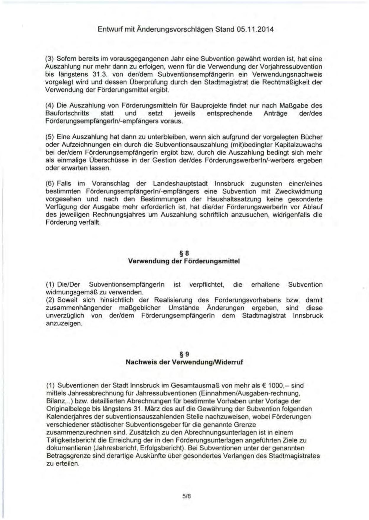 (1) Subventionen der Stadt Innsbruck im Gesamtausmaß von mehr als € 1000,-- sind