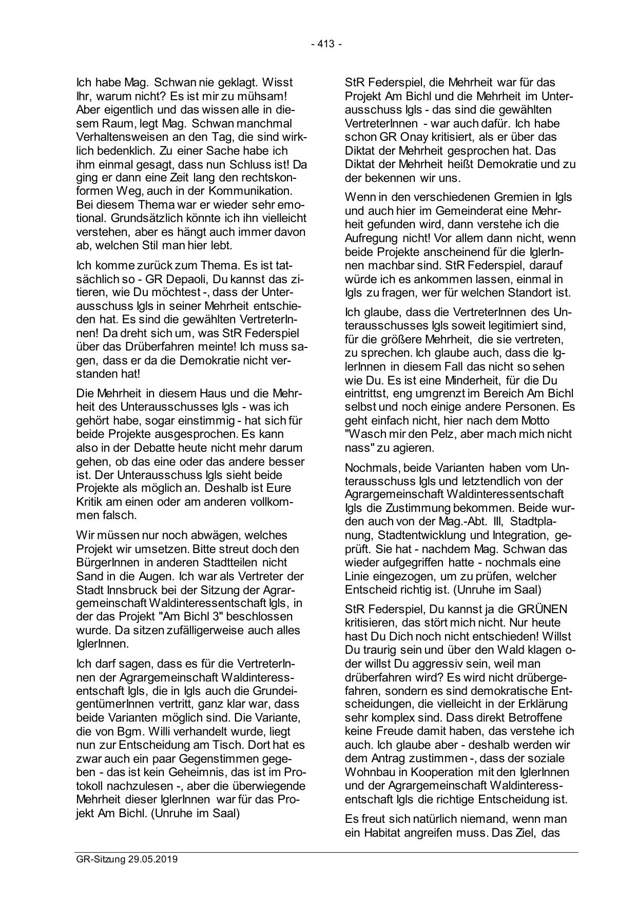Ich komme zurück zum Thema. Es ist tatsächlich so - GR Depaoli, Du kannst das zitieren, wie Du möchtest -, dass der Unterausschuss Igls in seiner Mehrheit entschieden hat. Es sind die gewählten VertreterInnen! Da dreht sich um, was StR Federspiel