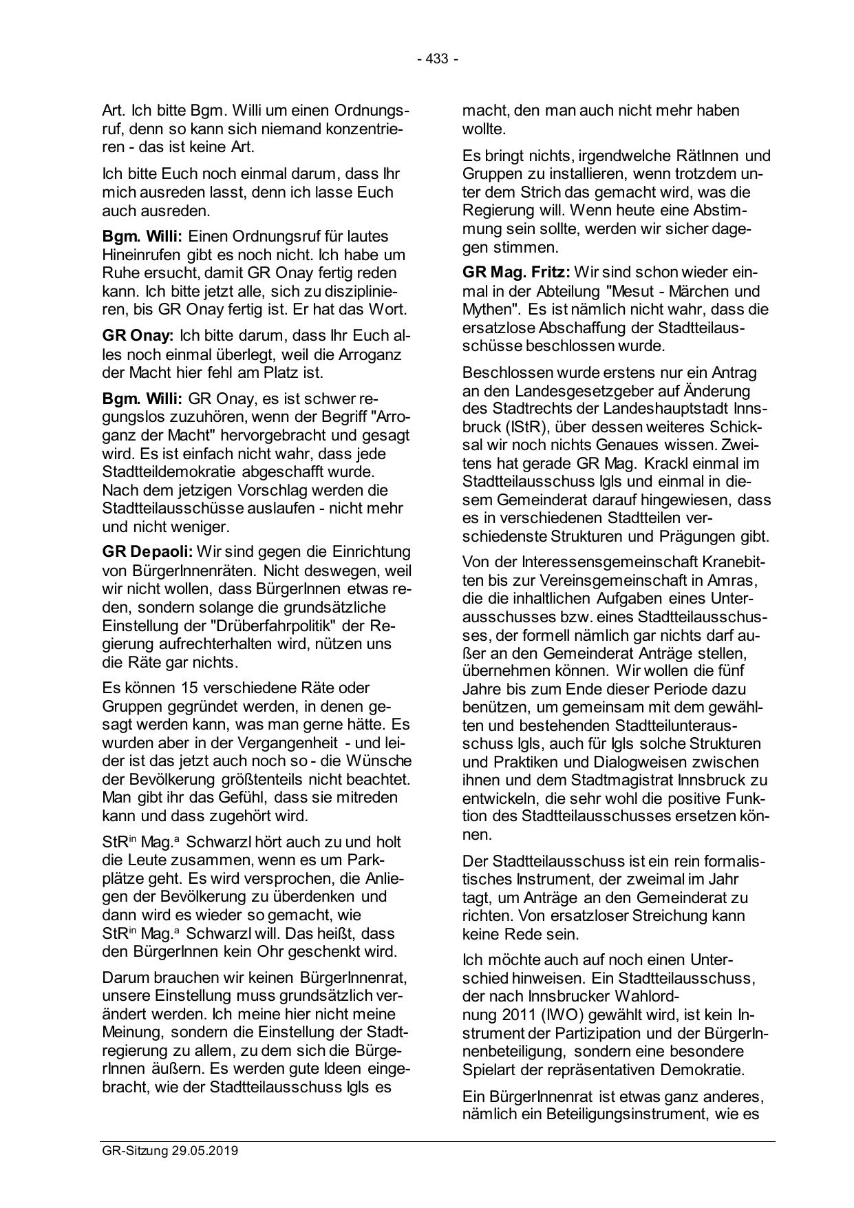 Meinung, sondern die Einstellung der Stadtregierung zu allem, zu dem sich die BürgerInnen äußern. Es werden gute Ideen eingebracht, wie der Stadtteilausschuss Igls es