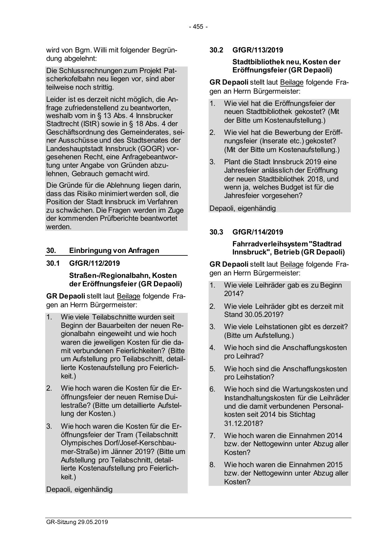 Landeshauptstadt Innsbruck (GOGR) vorgesehenen Recht, eine Anfragebeantwortung unter Angabe von Gründen abzulehnen, Gebrauch gemacht wird.
