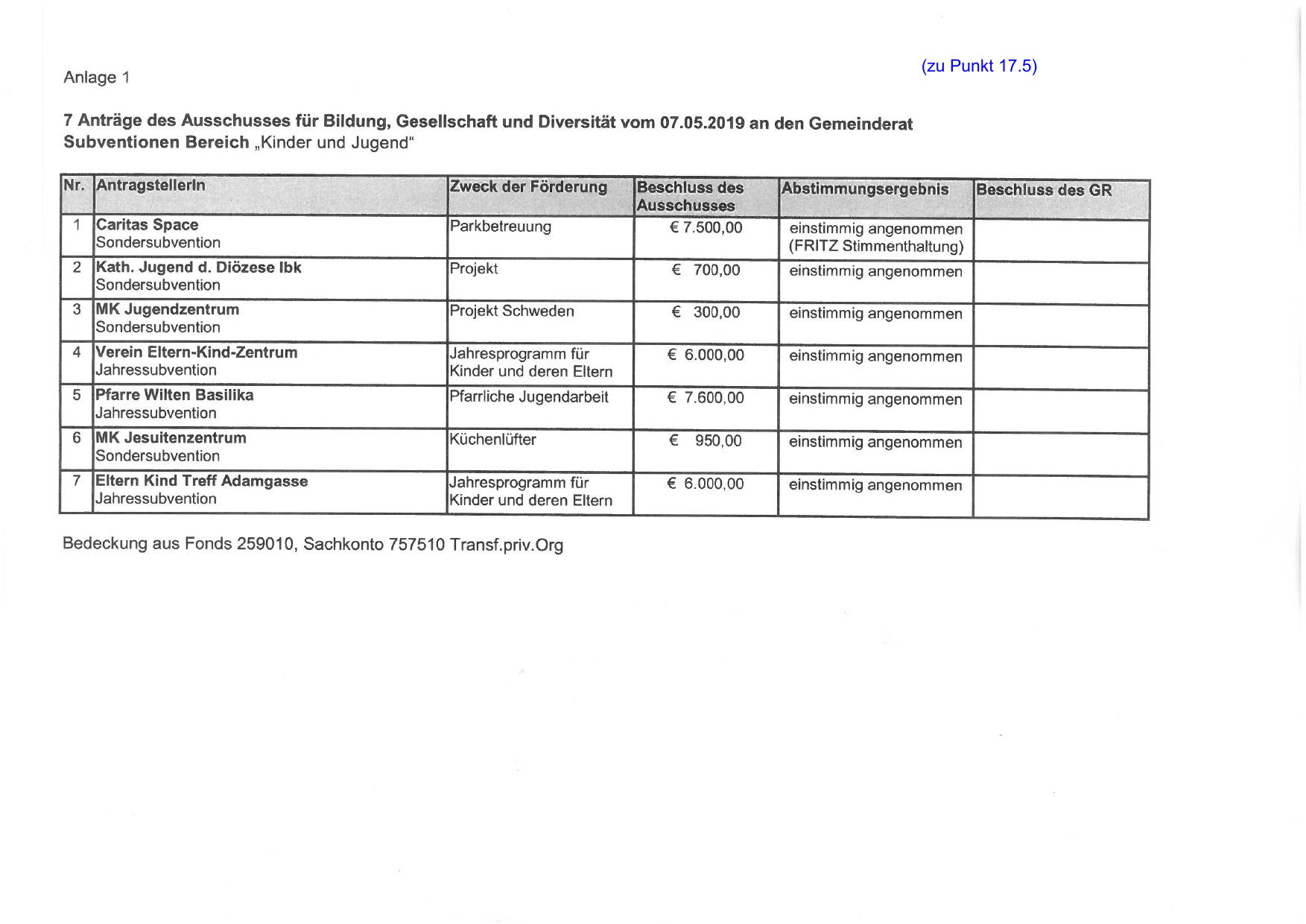 7 Anträge des Ausschusses für Bildung, Gesellschaft und Diversität vom 07.05.2019 an den Gemeinderat