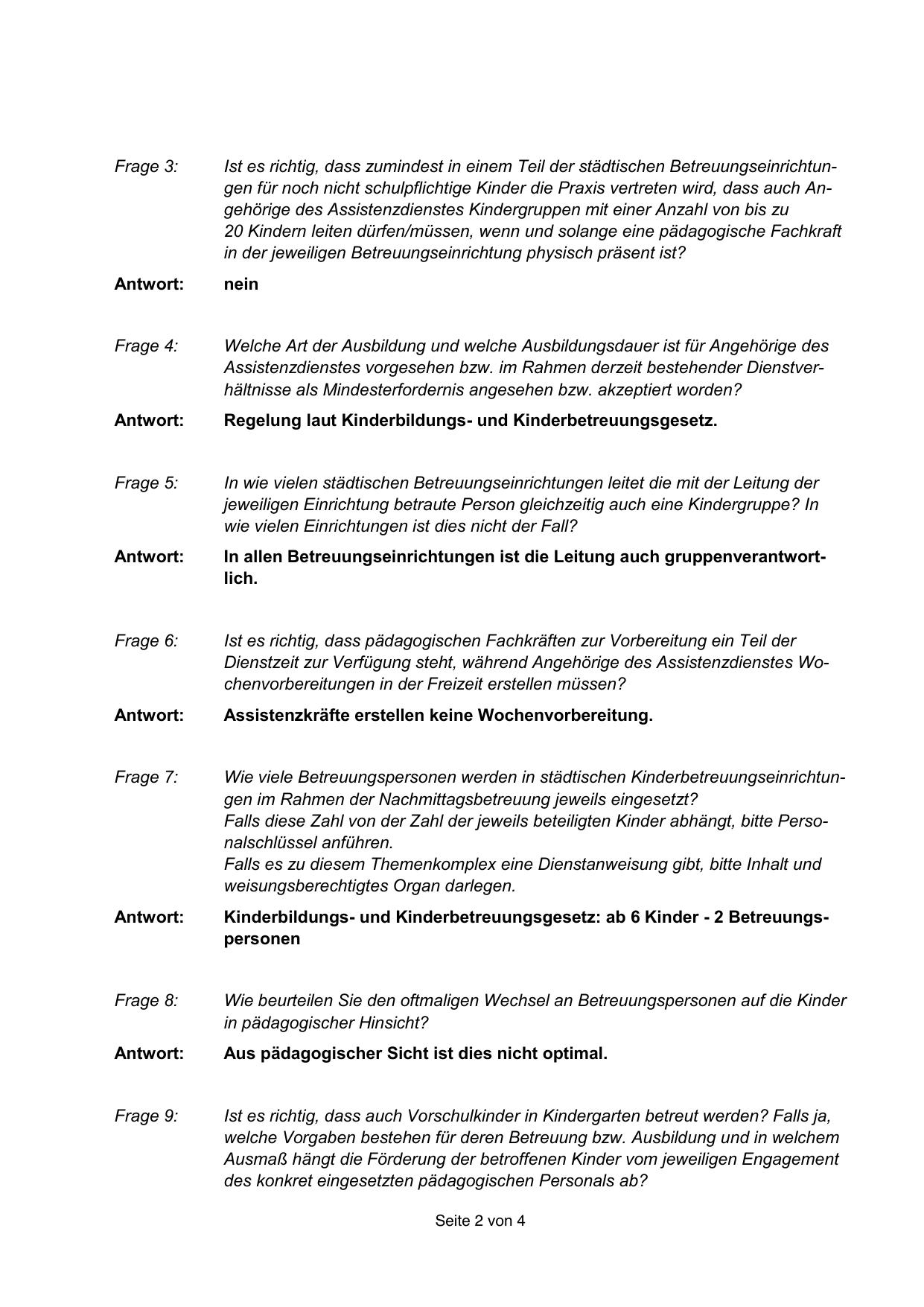 Ist es richtig, dass zumindest in einem Teil der städtischen Betreuungseinrichtungen für noch nicht schulpflichtige Kinder die Praxis vertreten wird, dass auch Angehörige des Assistenzdienstes Kindergruppen mit einer Anzahl von bis zu