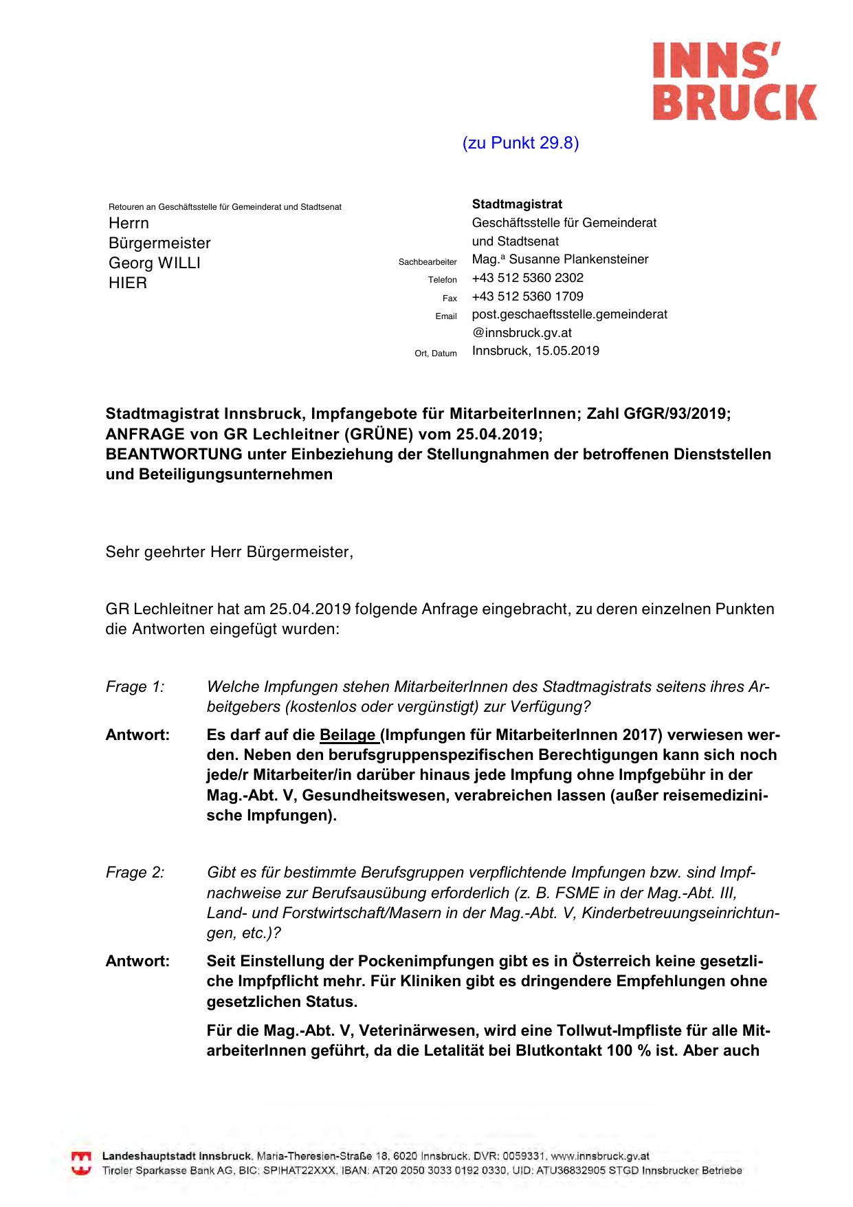 Stadtmagistrat Innsbruck, Impfangebote für MitarbeiterInnen; Zahl GfGR/93/2019;