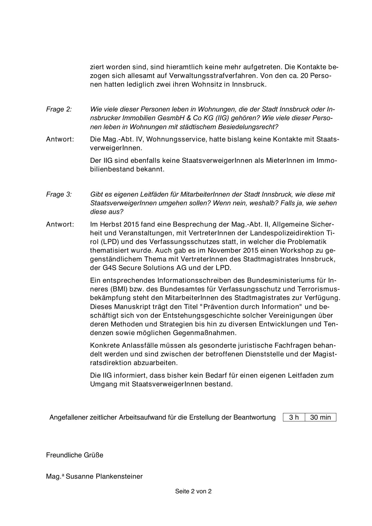 Im Herbst 2015 fand eine Besprechung der Mag.-Abt. II, Allgemeine Sicherheit und Veranstaltungen, mit VertreterInnen der Landespolizeidirektion Tirol (LPD) und des Verfassungsschutzes statt, in welcher die Problematik