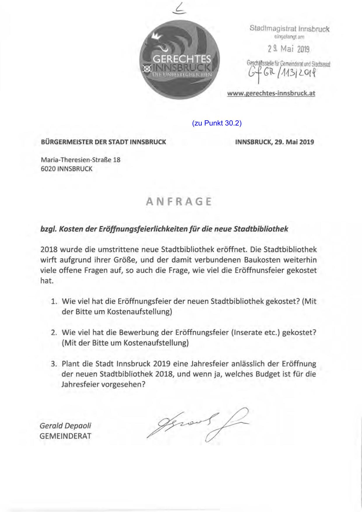3. Plant die Stadt Innsbruck 2019 eine Jahresfeier anlässlich der Eröffnung