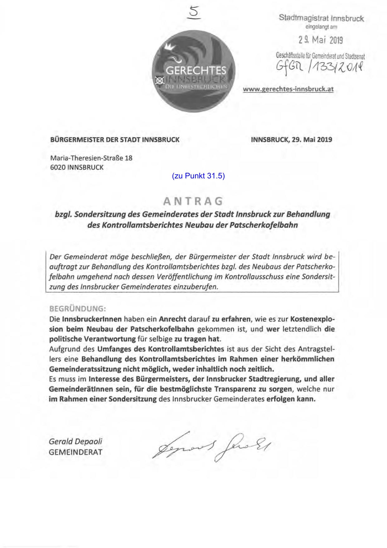 Der Gemeinderat möge beschließen, der Bürgermeister der Stadt Innsbruck wird beauftragt zur Behandlung des Kontrollamtsberichtes bzgl. des Neubaus der Patscherkofelbahn umgehend nach dessen Veröffentlichung im Kontrollausschuss eine Sondersitzung des lnnsbrucker Gemeinderates einzuberufen.