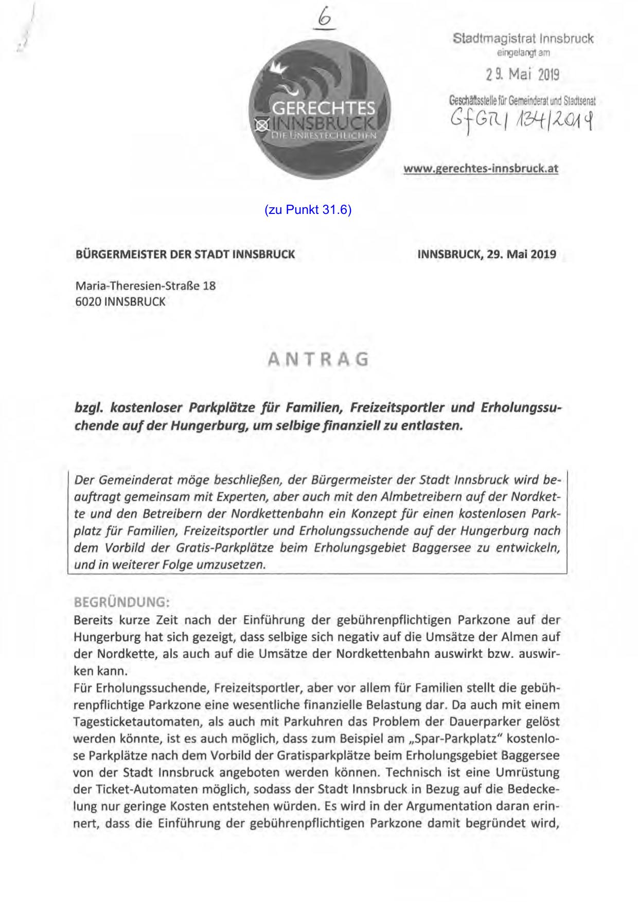 bzgl. kostenloser Parkplätze für Familien, Freizeitsport/er und Erholungssuchende auf der Hungerburg, um selbige finanziell zu entlasten.