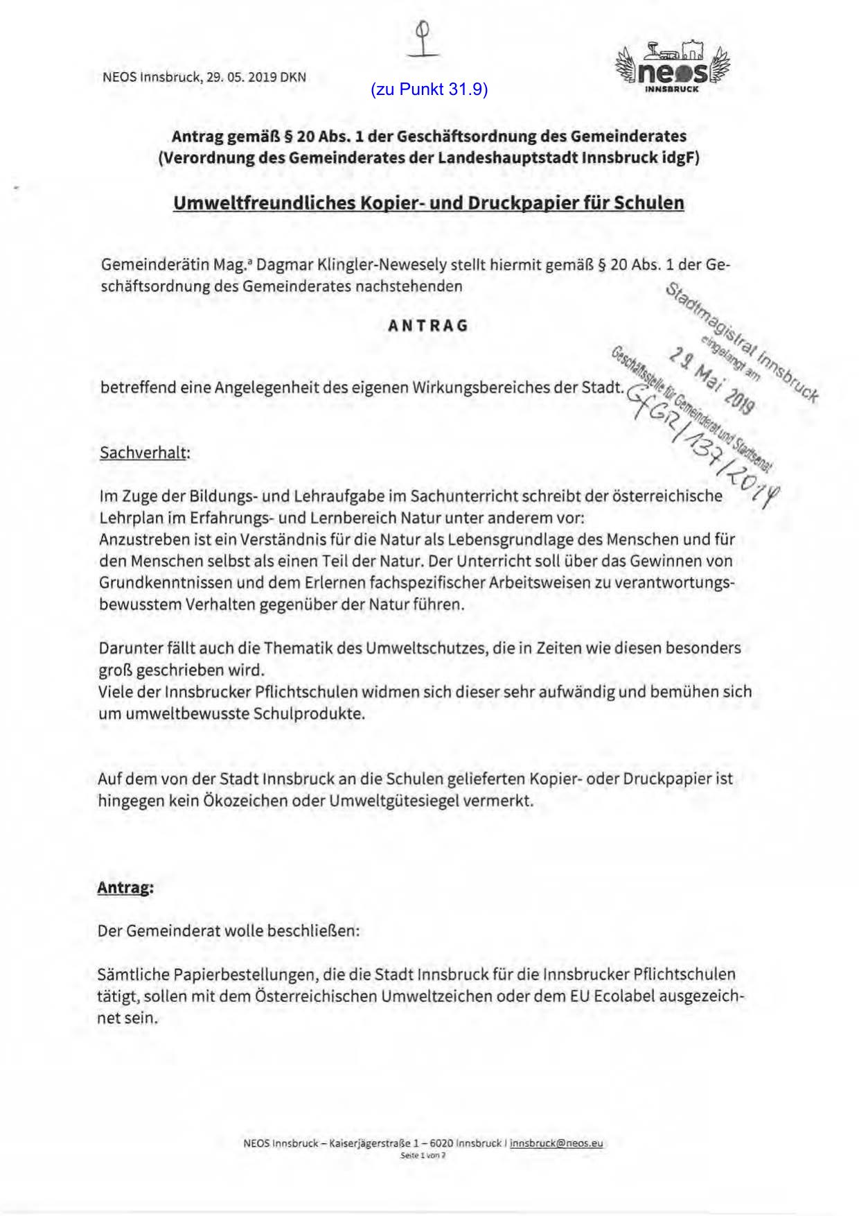 Sämtliche Papierbestellungen, die die Stadt Innsbruck für die lnnsbrucker Pfli chtschulen