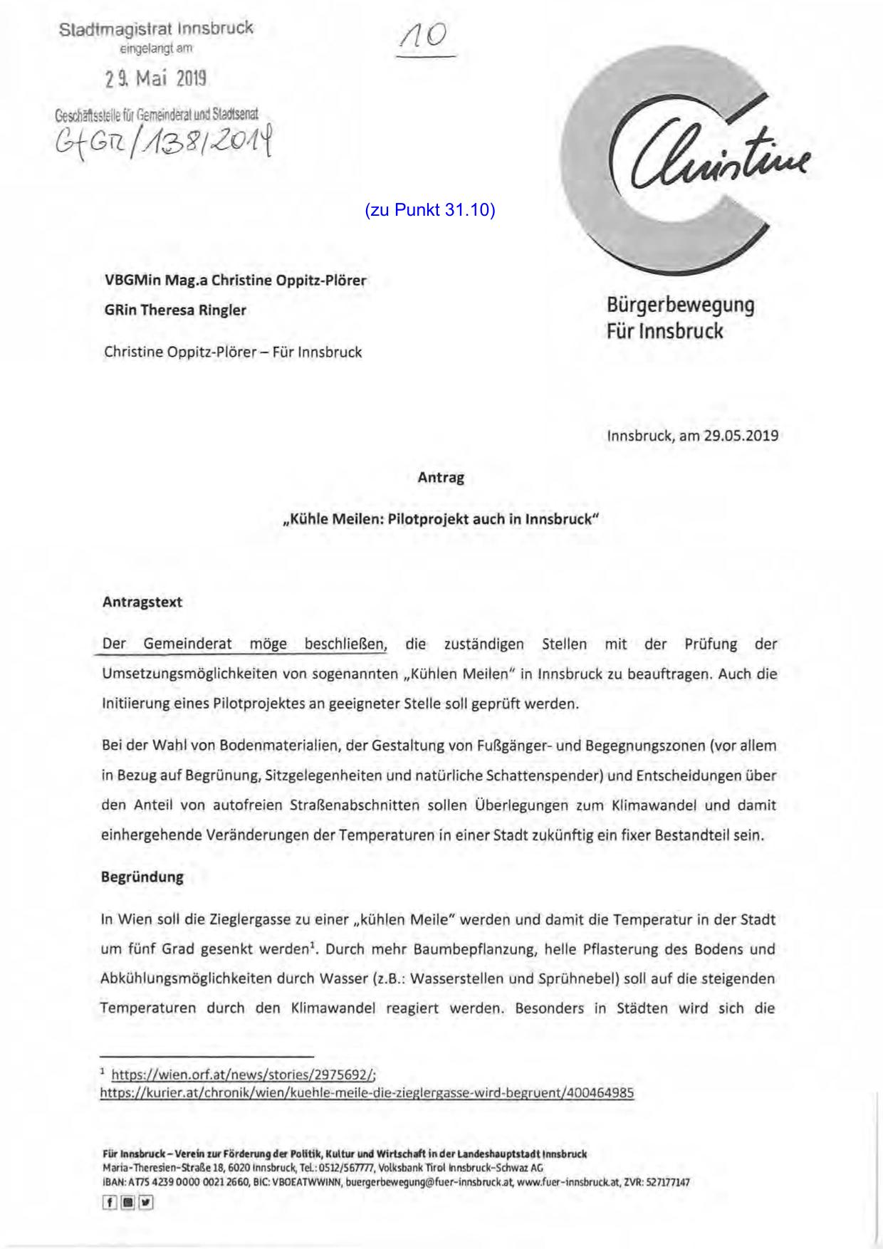 Umsetzungsmöglichkeiten von sogenannten „Kühlen Meilen " in Innsbruck zu beauftragen . Auch die