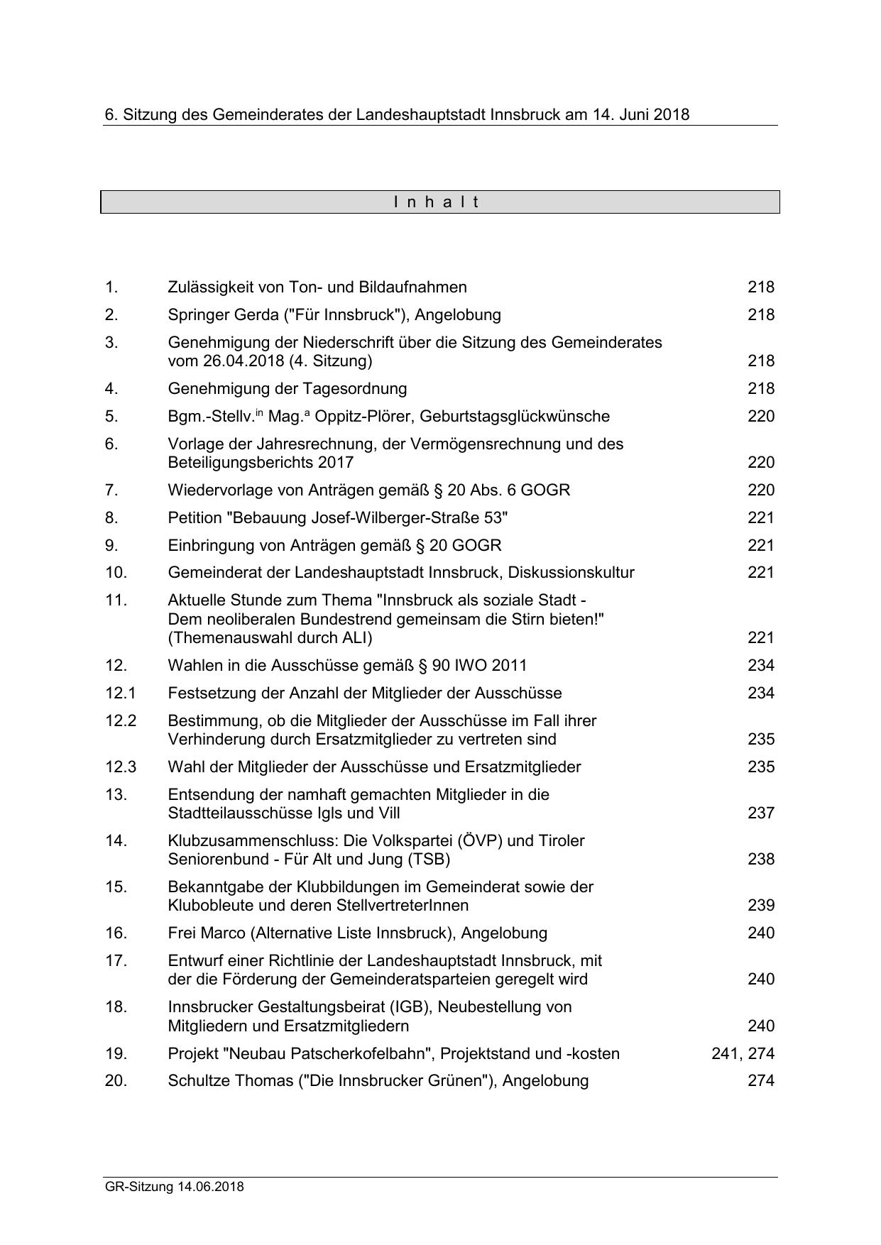 6. Sitzung des Gemeinderates der Landeshauptstadt Innsbruck am 14. Juni 2018
