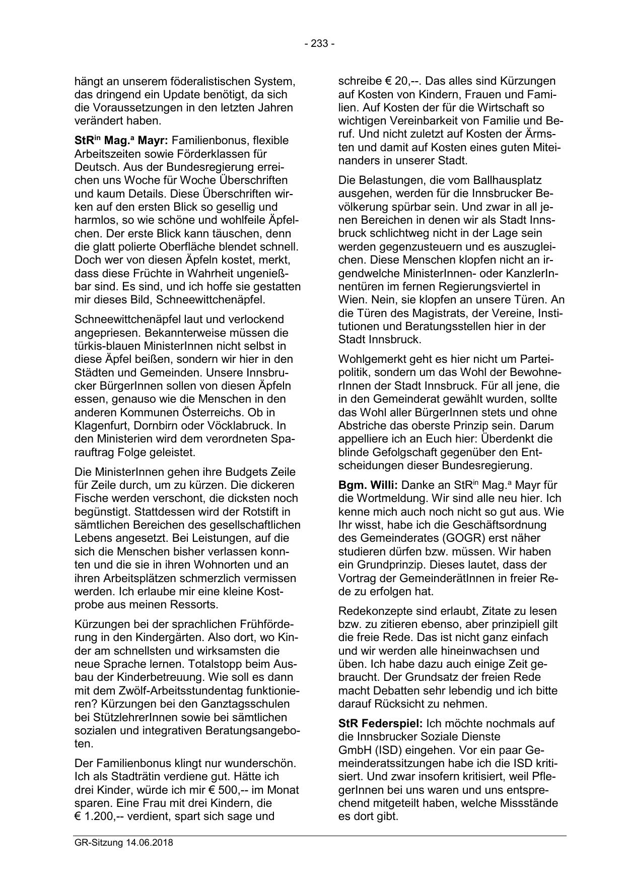 ausgehen, werden für die Innsbrucker Bevölkerung spürbar sein. Und zwar in all jenen Bereichen in denen wir als Stadt Innsbruck schlichtweg nicht in der Lage sein
