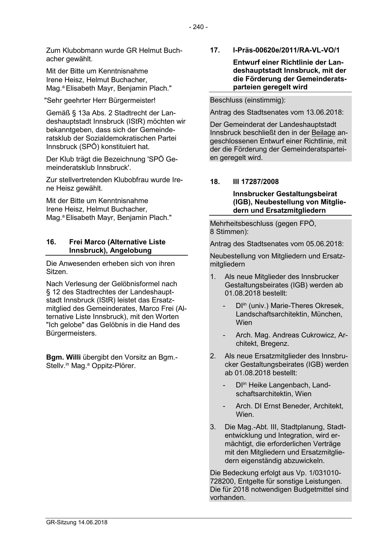 Gemäß § 13a Abs. 2 Stadtrecht der Landeshauptstadt Innsbruck (IStR) möchten wir