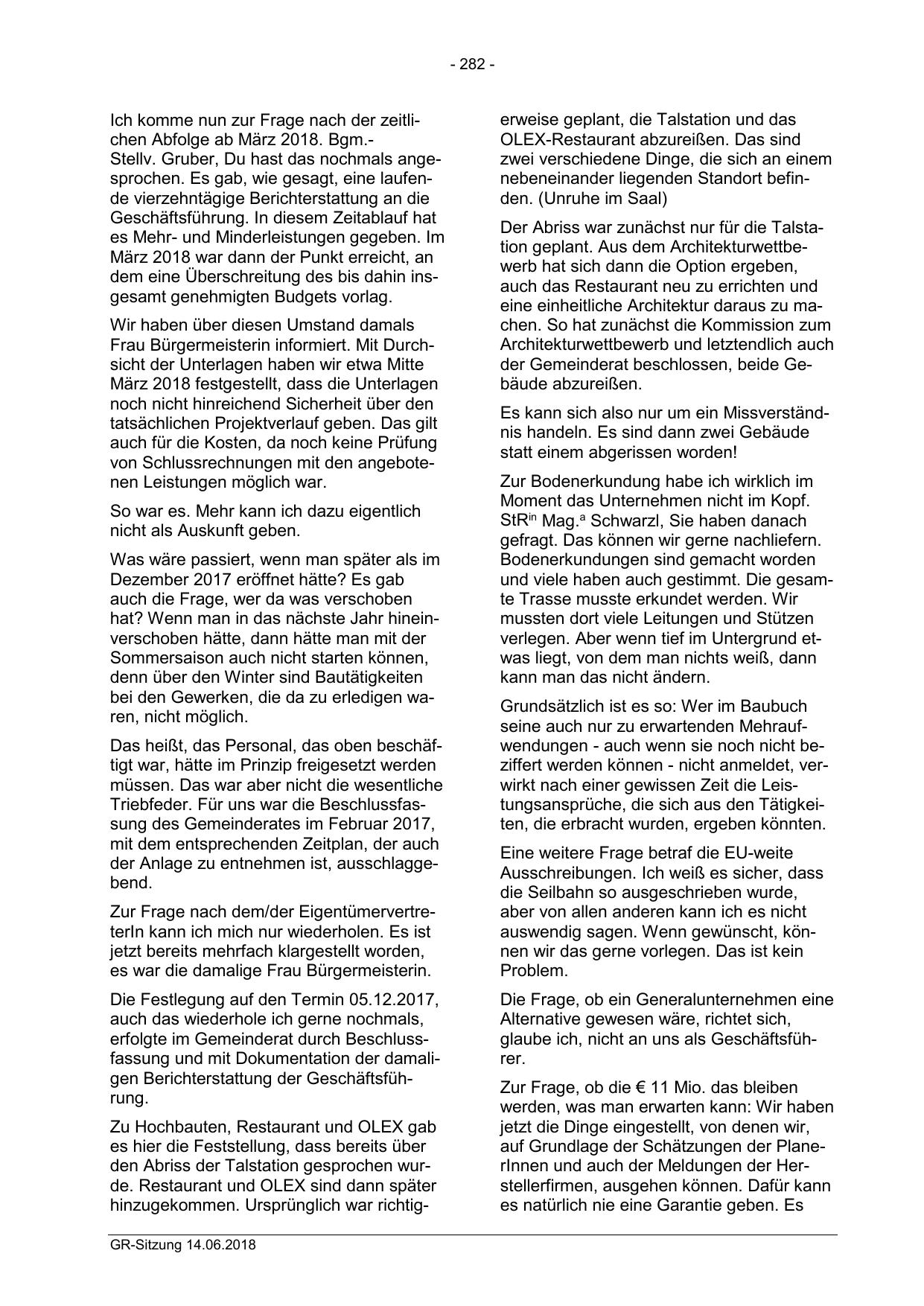 Ich komme nun zur Frage nach der zeitlichen Abfolge ab März 2018. Bgm.Stellv. Gruber, Du hast das nochmals angesprochen. Es gab, wie gesagt, eine laufende vierzehntägige Berichterstattung an die