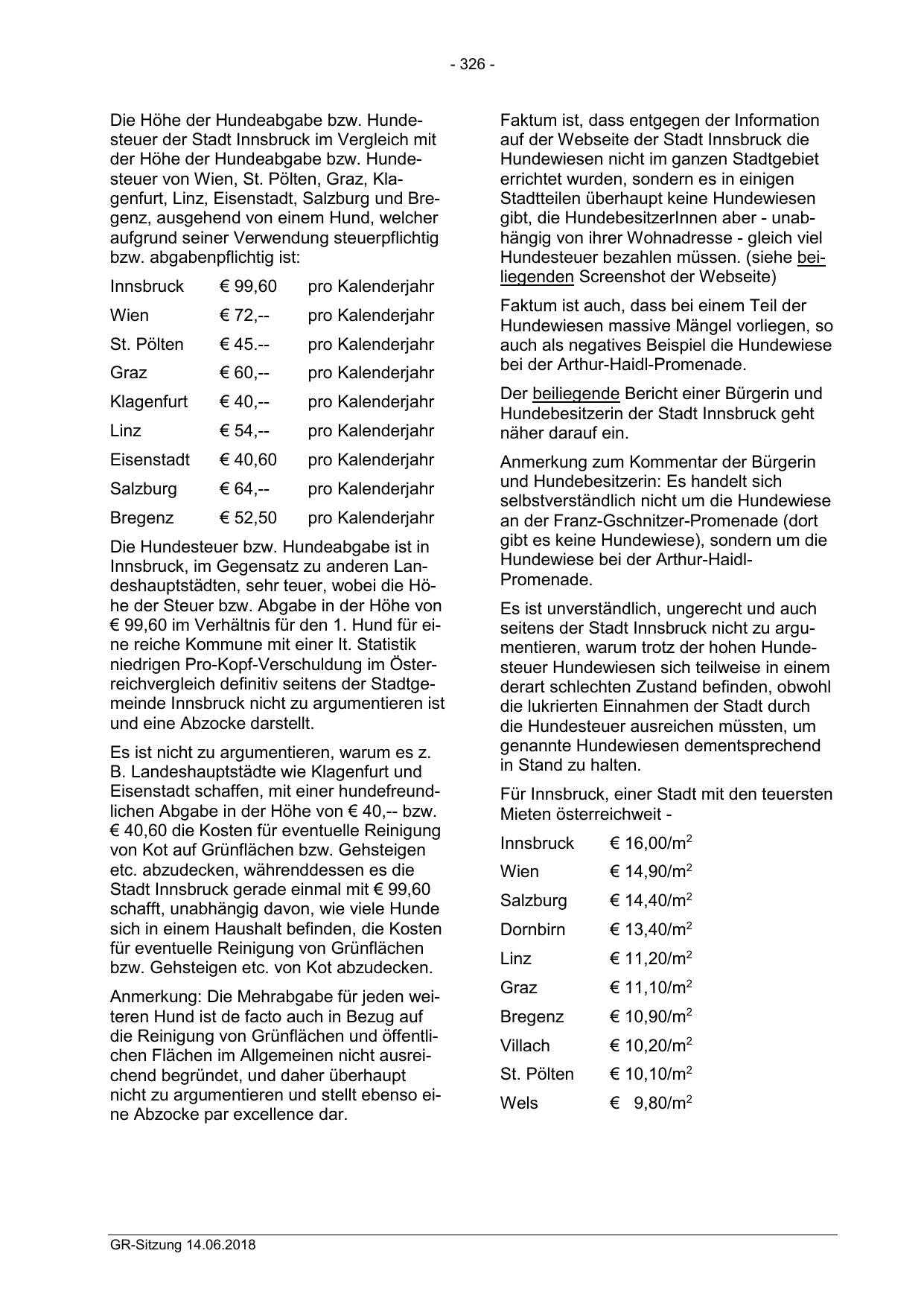 seitens der Stadt Innsbruck nicht zu argumentieren, warum trotz der hohen Hundesteuer Hundewiesen sich teilweise in einem