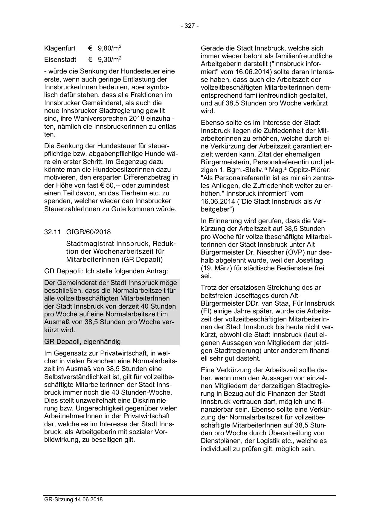 (FI) einige Jahre später, wurde die Arbeitszeit der vollzeitbeschäftigten MitarbeiterInnen der Stadt Innsbruck bis heute nicht verkürzt, obwohl die Stadt Innsbruck (Iaut eigenen Aussagen von Mitgliedern der jetzigen Stadtregierung) unter anderem finanziell sehr gut dasteht.