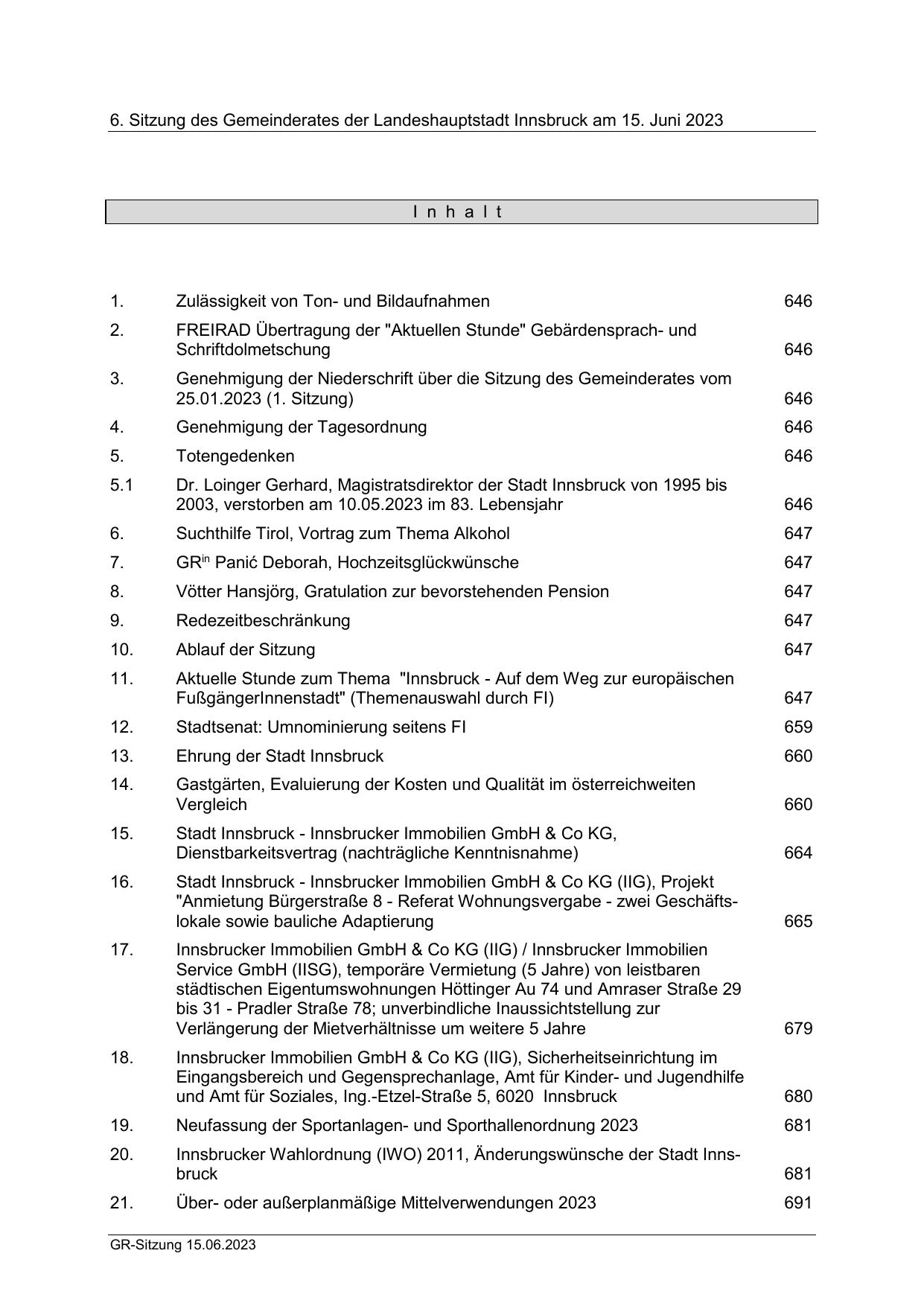 6. Sitzung des Gemeinderates der Landeshauptstadt Innsbruck am 15. Juni 2023