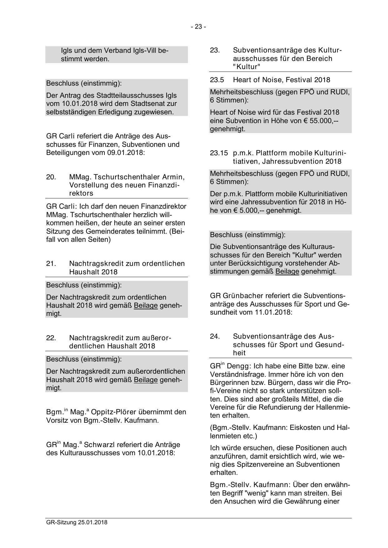 GR Grünbacher referiert die Subventionsanträge des Ausschusses für Sport und Gesundheit vom 11.01.2018: