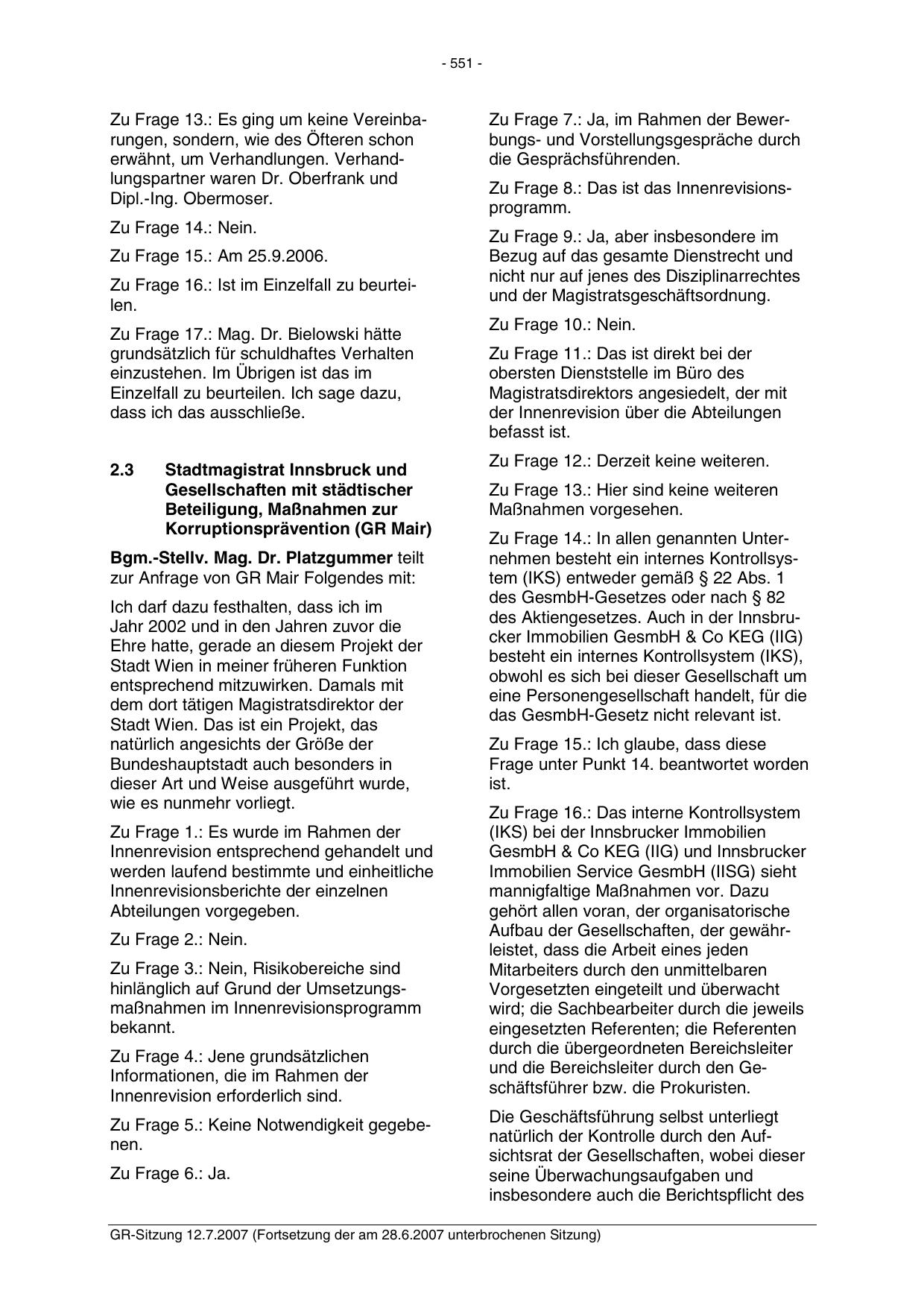 GR-Sitzung 12.7.2007 (Fortsetzung der am 28.6.2007 unterbrochenen Sitzung)