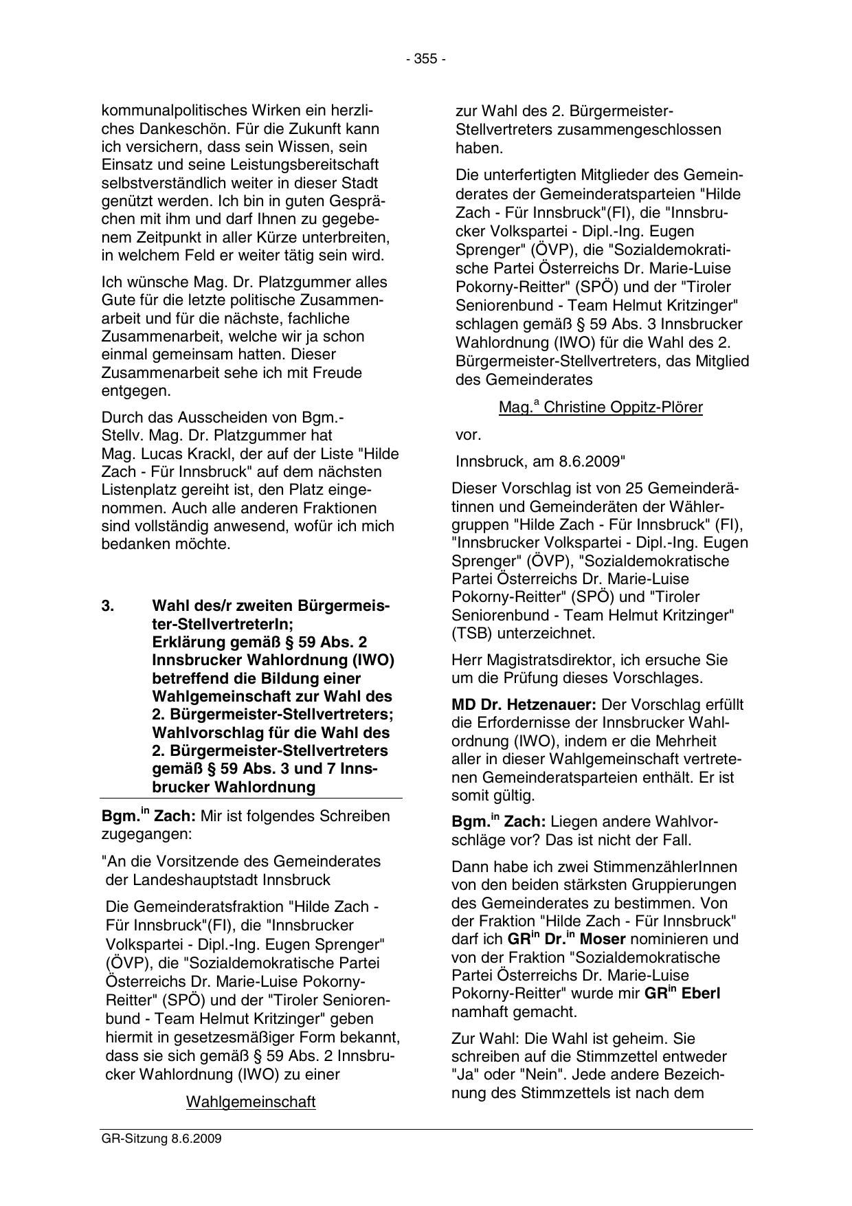 aller in dieser Wahlgemeinschaft vertretenen Gemeinderatsparteien enthält. Er ist