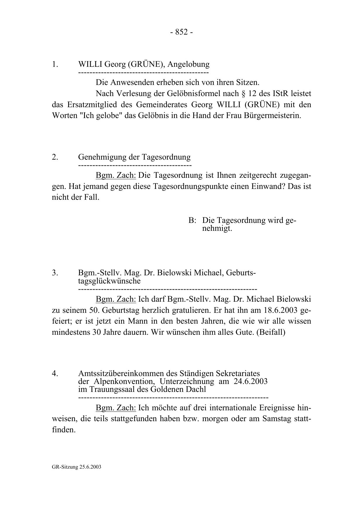 ---------------------------------------Bgm. Zach: Die Tagesordnung ist Ihnen zeitgerecht zugegangen. Hat jemand gegen diese Tagesordnungspunkte einen Einwand? Das ist