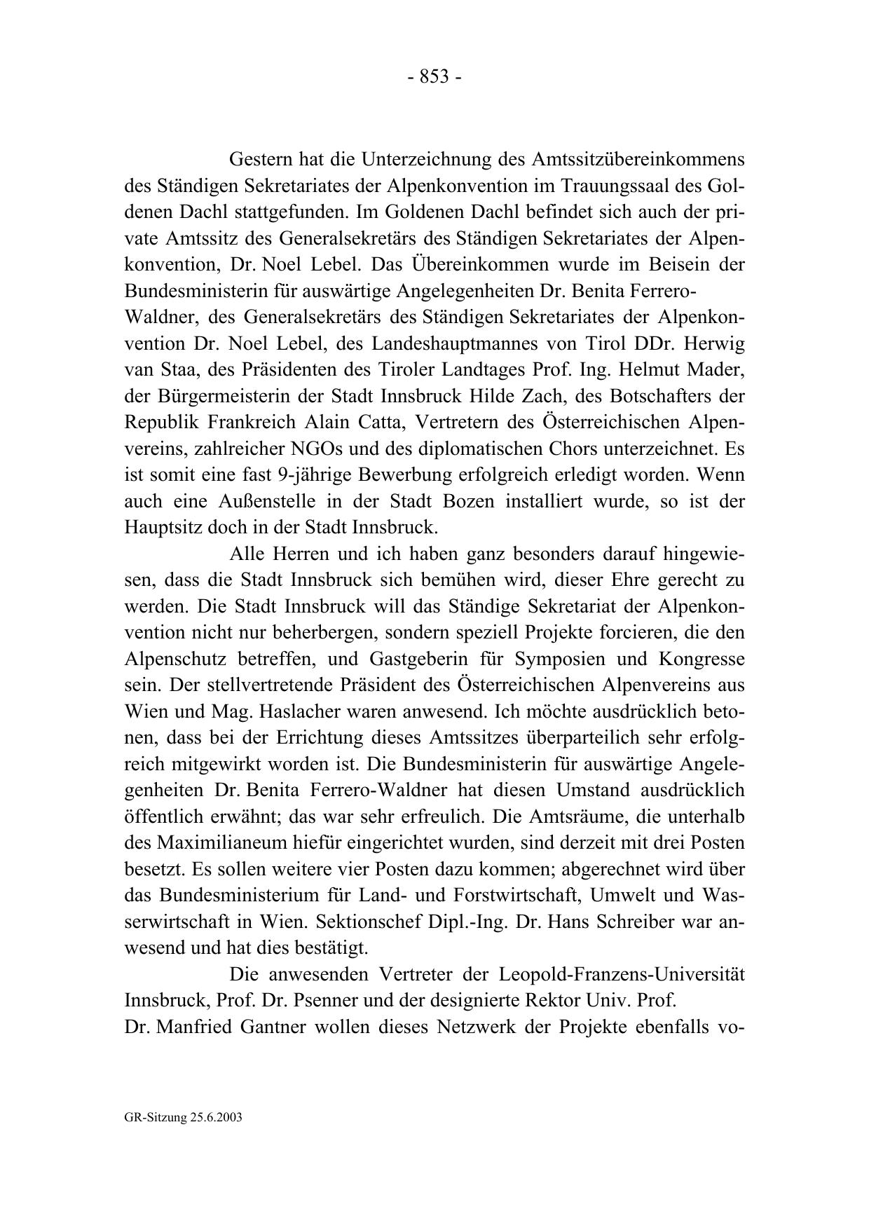 Bundesministerin für auswärtige Angelegenheiten Dr. Benita FerreroWaldner, des Generalsekretärs des Ständigen Sekretariates der Alpenkonvention Dr. Noel Lebel, des Landeshauptmannes von Tirol DDr. Herwig