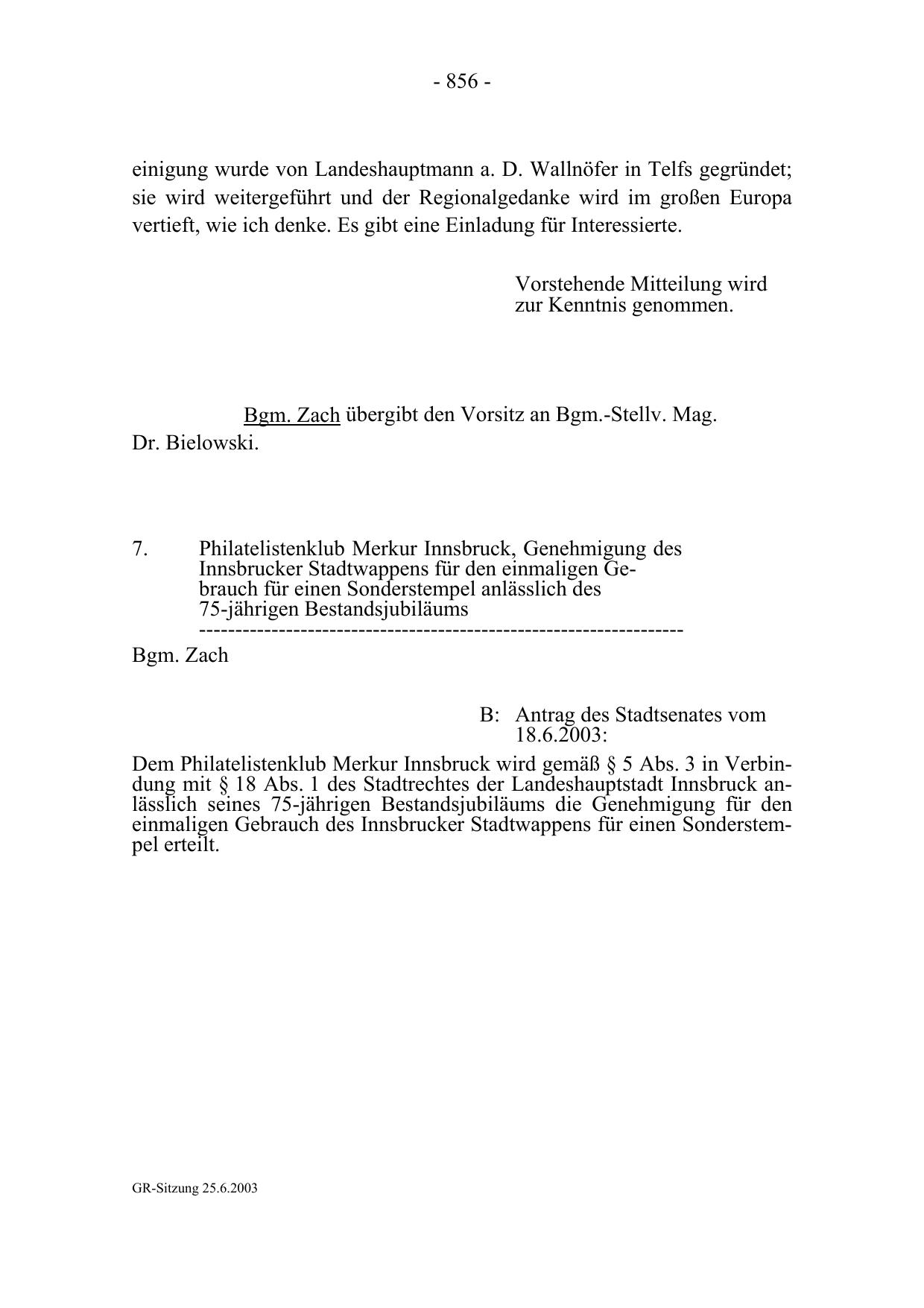 Dem Philatelistenklub Merkur Innsbruck wird gemäß § 5 Abs. 3 in Verbindung mit § 18 Abs. 1 des Stadtrechtes der Landeshauptstadt Innsbruck anlässlich seines 75-jährigen Bestandsjubiläums die Genehmigung für den