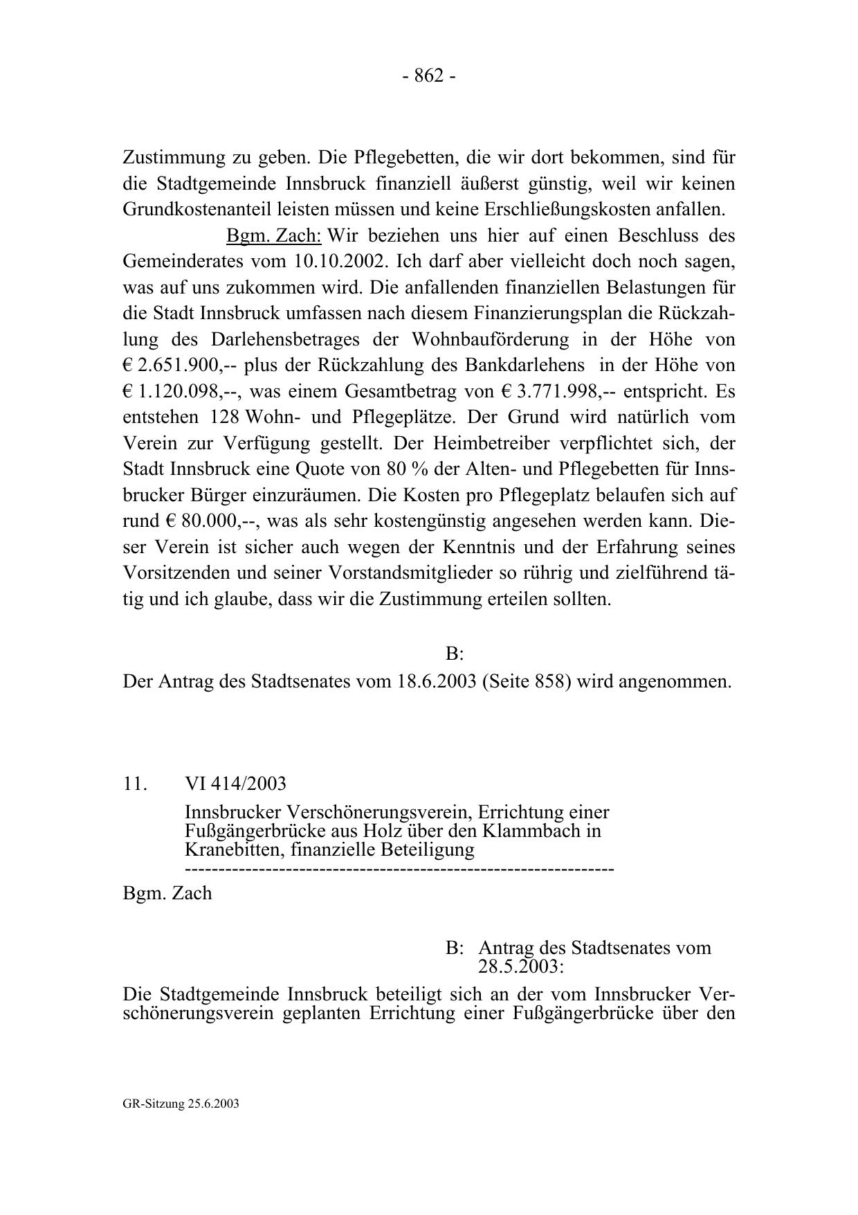 Der Antrag des Stadtsenates vom 18.6.2003 (Seite 858) wird angenommen.
