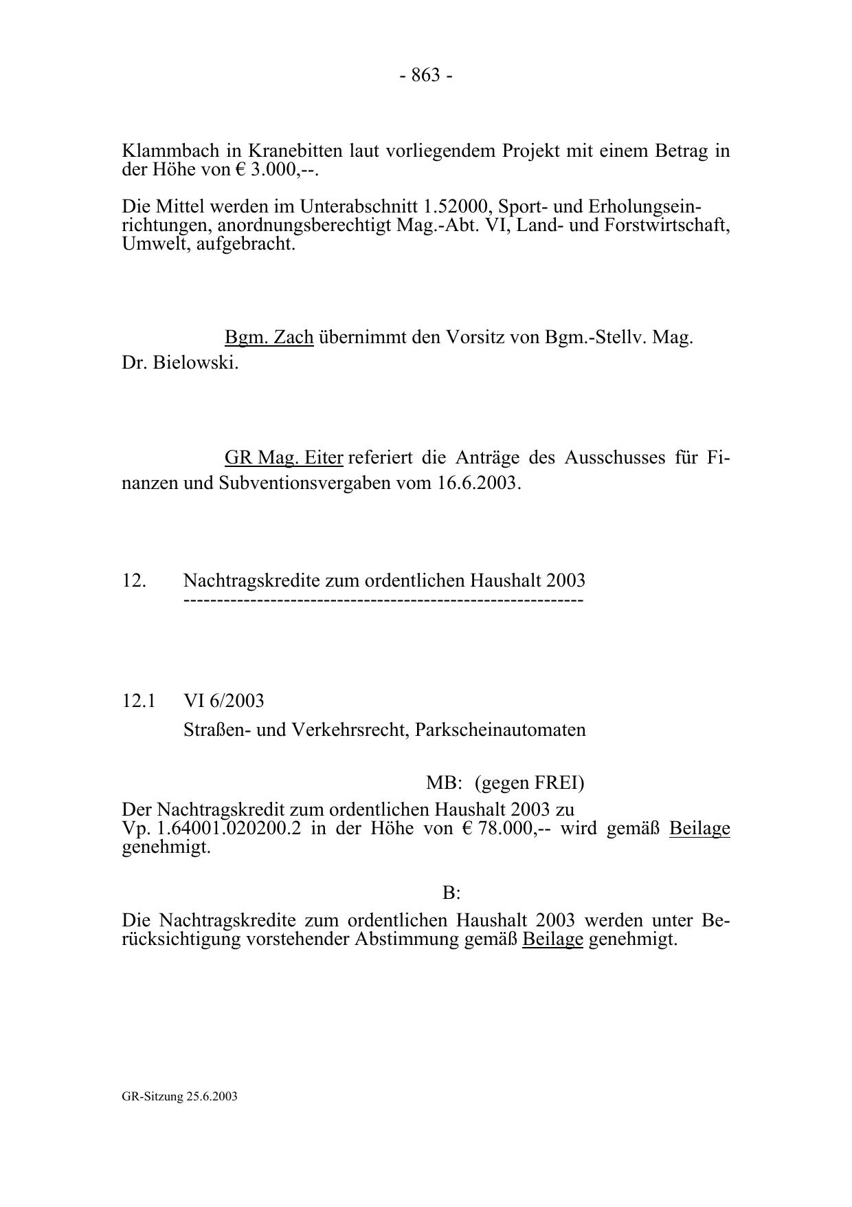 GR Mag. Eiter referiert die Anträge des Ausschusses für Finanzen und Subventionsvergaben vom 16.6.2003.