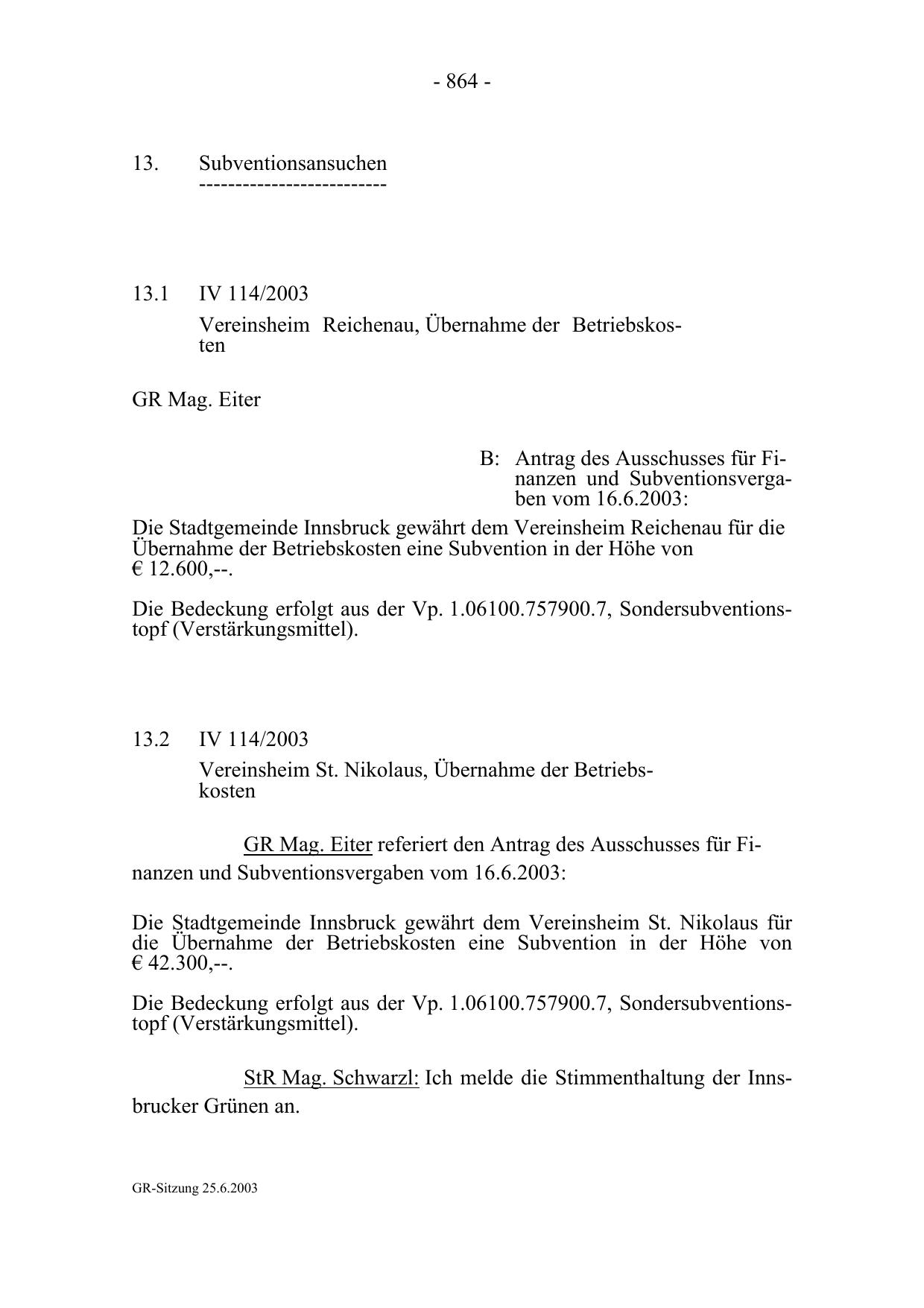GR Mag. Eiter referiert den Antrag des Ausschusses für Finanzen und Subventionsvergaben vom 16.6.2003: