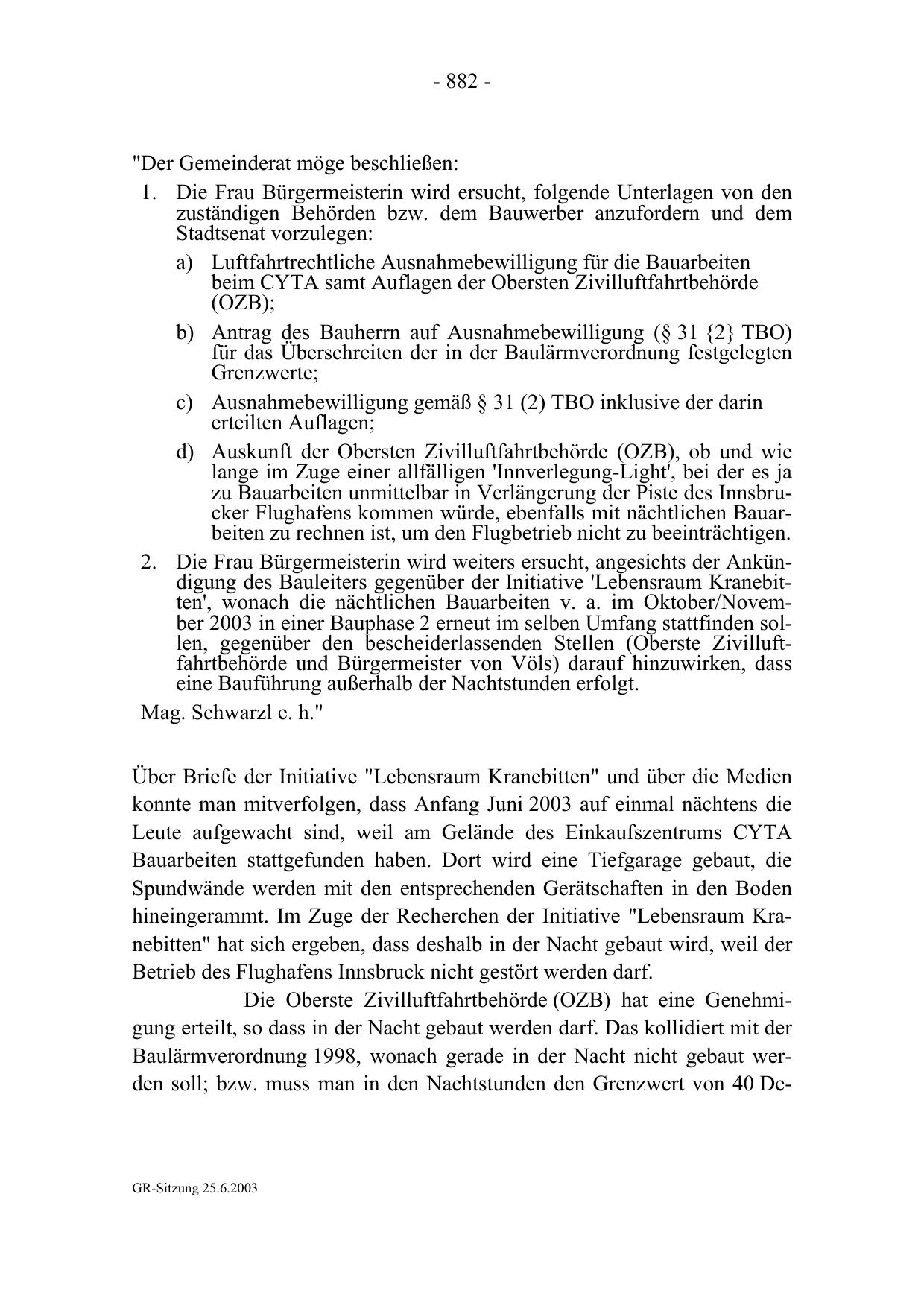 2. Die Frau Bürgermeisterin wird weiters ersucht, angesichts der Ankündigung des Bauleiters gegenüber der Initiative "Lebensraum Kranebitten", wonach die nächtlichen Bauarbeiten v. a. im Oktober/November 2003 in einer Bauphase 2 erneut im selben Umfang stattfinden sollen, gegenüber den bescheiderlassenden Stellen (Oberste Zivilluftfahrtbehörde und Bürgermeister von Völs) darauf hinzuwirken, dass