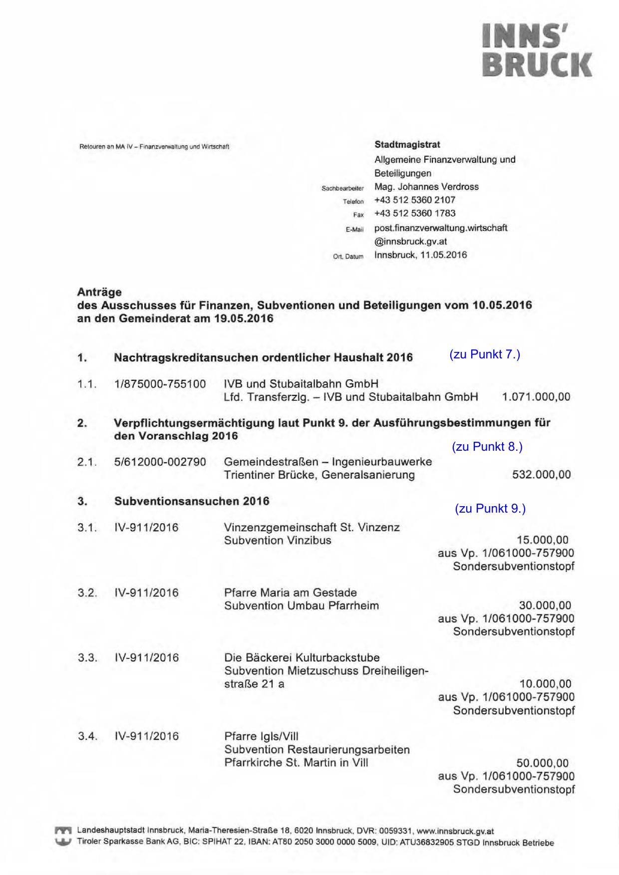 Nachtragskreditansuchen ordentlicher Haushalt 2016