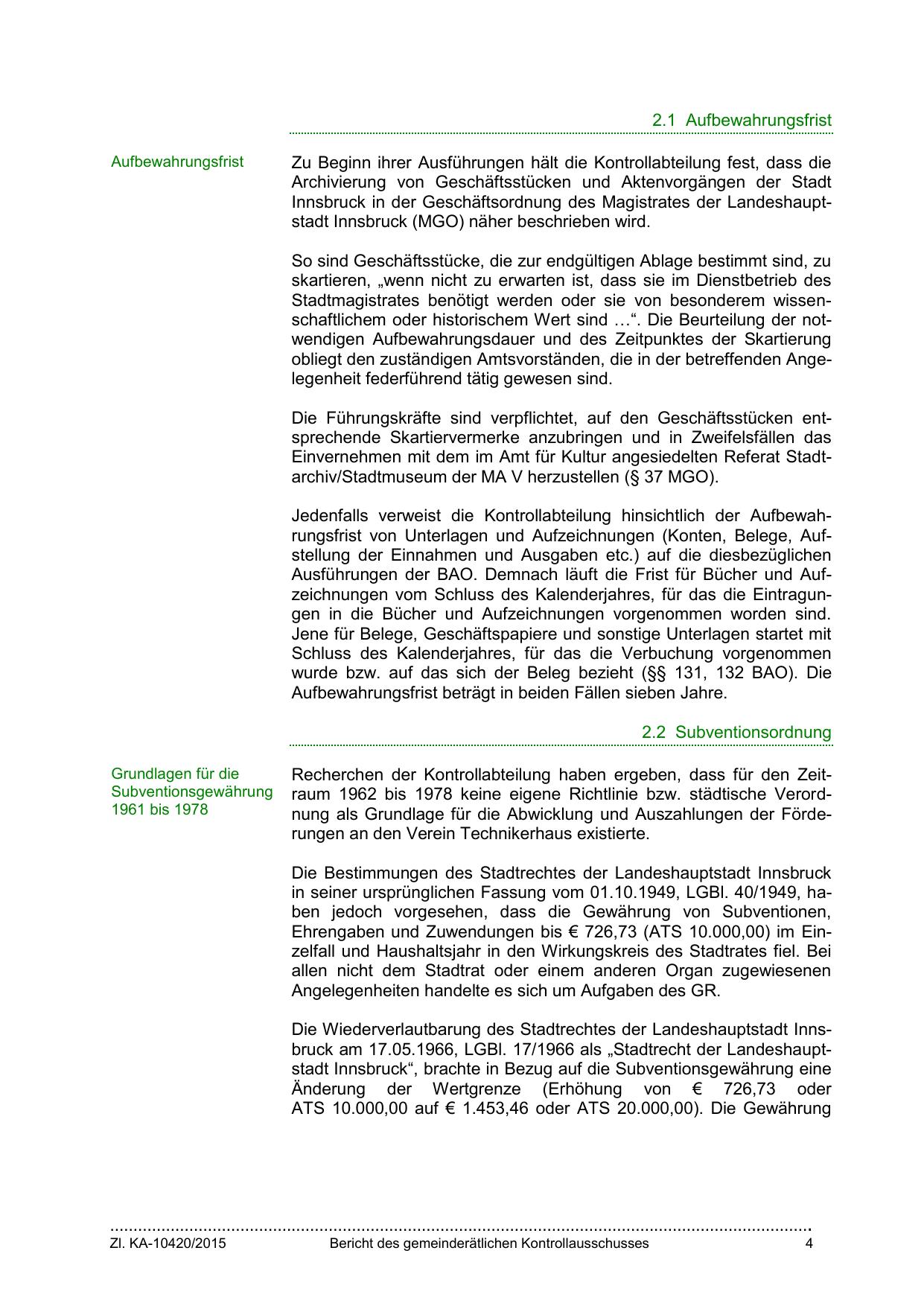 Die Wiederverlautbarung des Stadtrechtes der Landeshauptstadt Innsbruck am 17.05.1966, LGBl. 17/1966 als „Stadtrecht der Landeshauptstadt Innsbruck“, brachte in Bezug auf die Subventionsgewährung eine