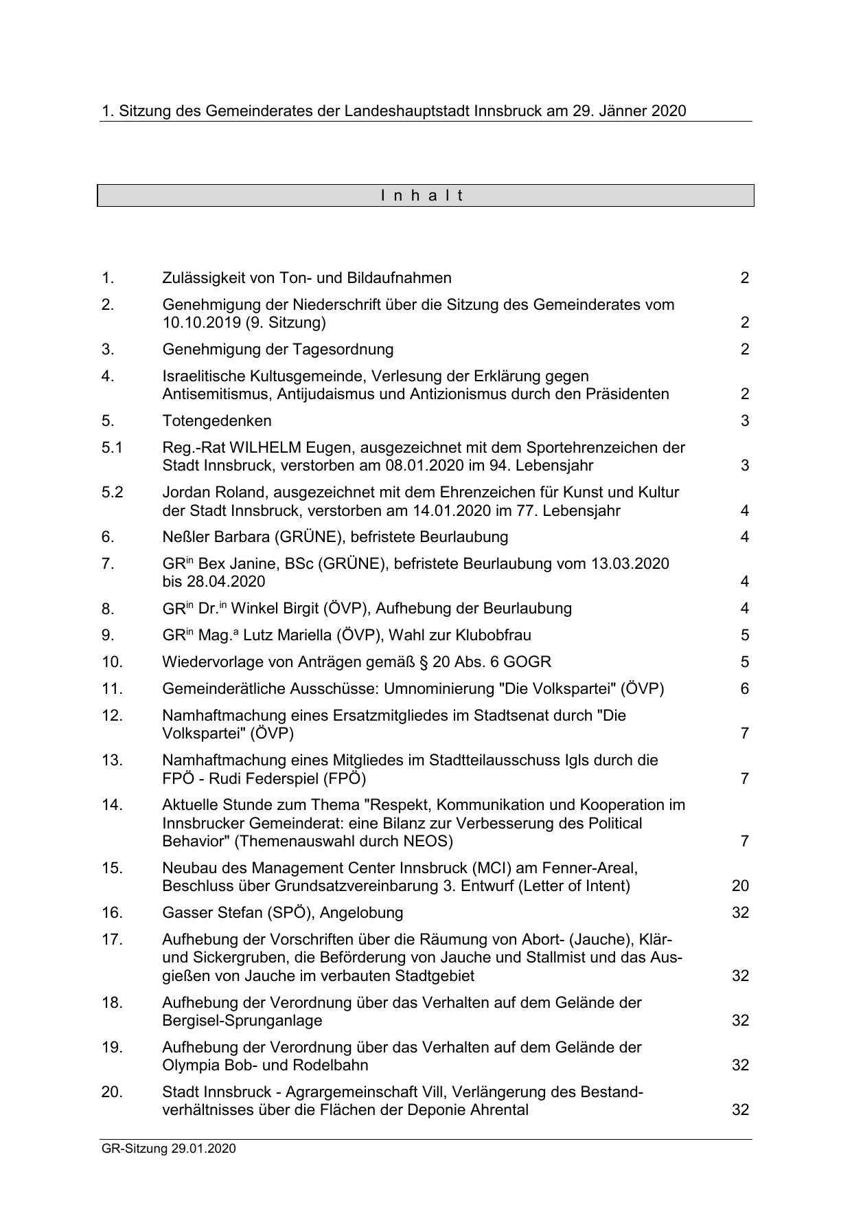 1. Sitzung des Gemeinderates der Landeshauptstadt Innsbruck am 29. Jänner 2020