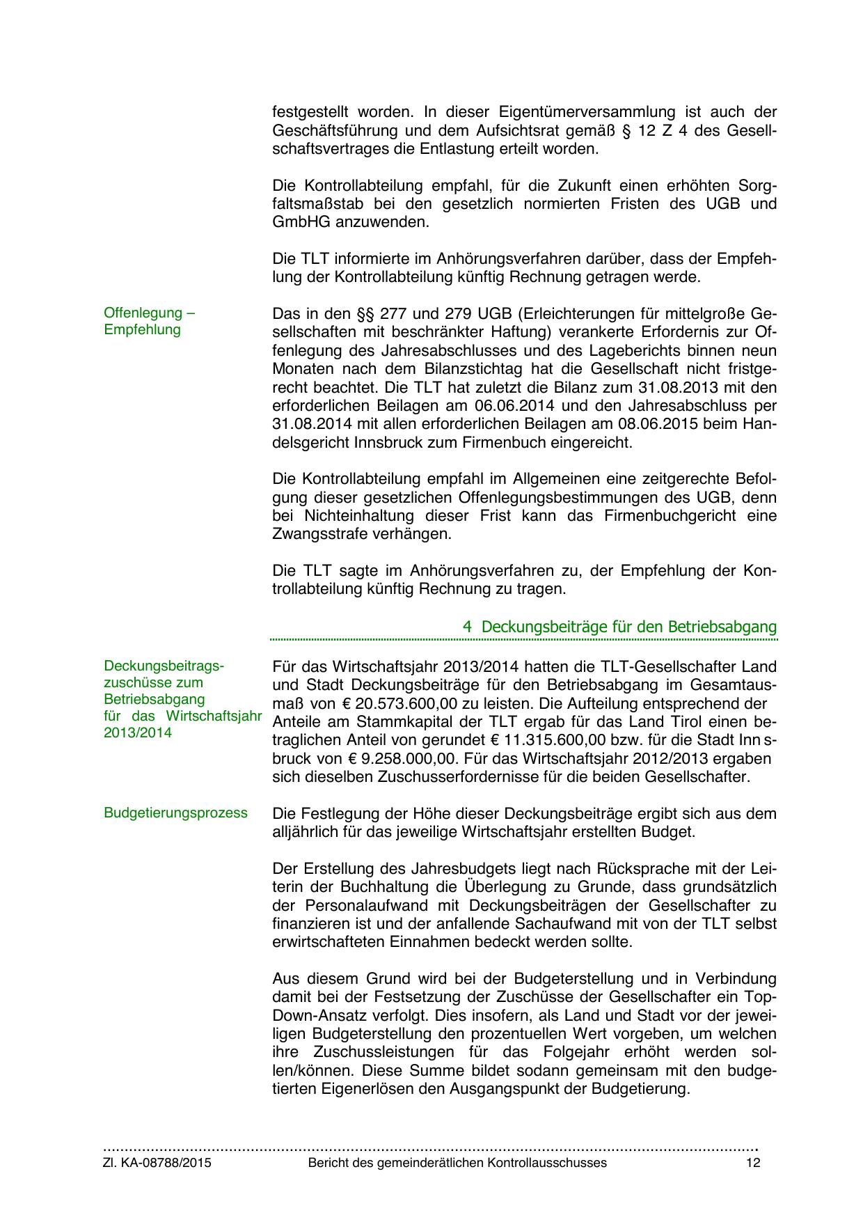 Die Kontrollabteilung empfahl, für die Zukunft einen erhöhten Sorgfaltsmaßstab bei den gesetzlich normierten Fristen des UGB und