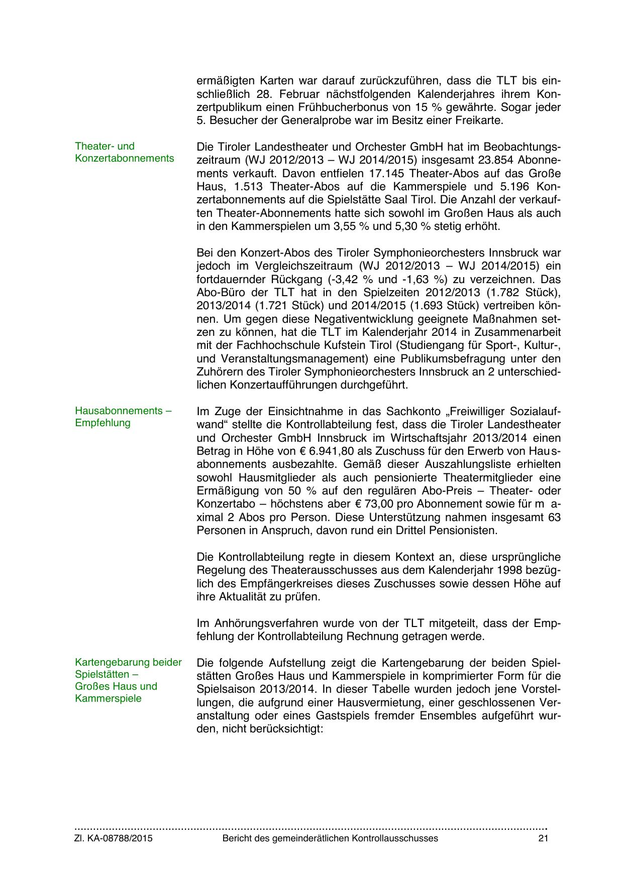 Die Tiroler Landestheater und Orchester GmbH hat im Beobachtungszeitraum (WJ 2012/2013 – WJ 2014/2015) insgesamt 23.854 Abonnements verkauft. Davon entfielen 17.145 Theater-Abos auf das Große