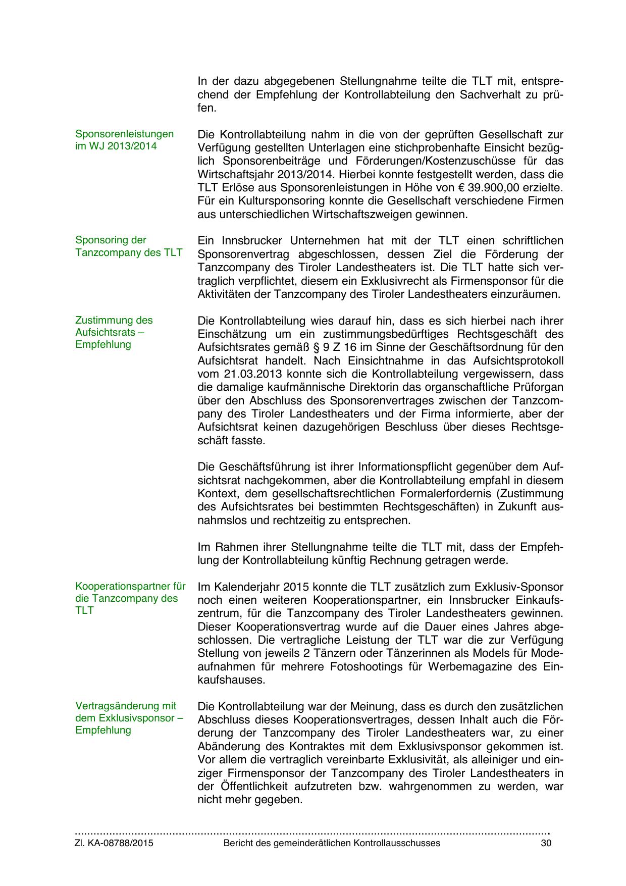 In der dazu abgegebenen Stellungnahme teilte die TLT mit, entsprechend der Empfehlung der Kontrollabteilung den Sachverhalt zu prüfen.