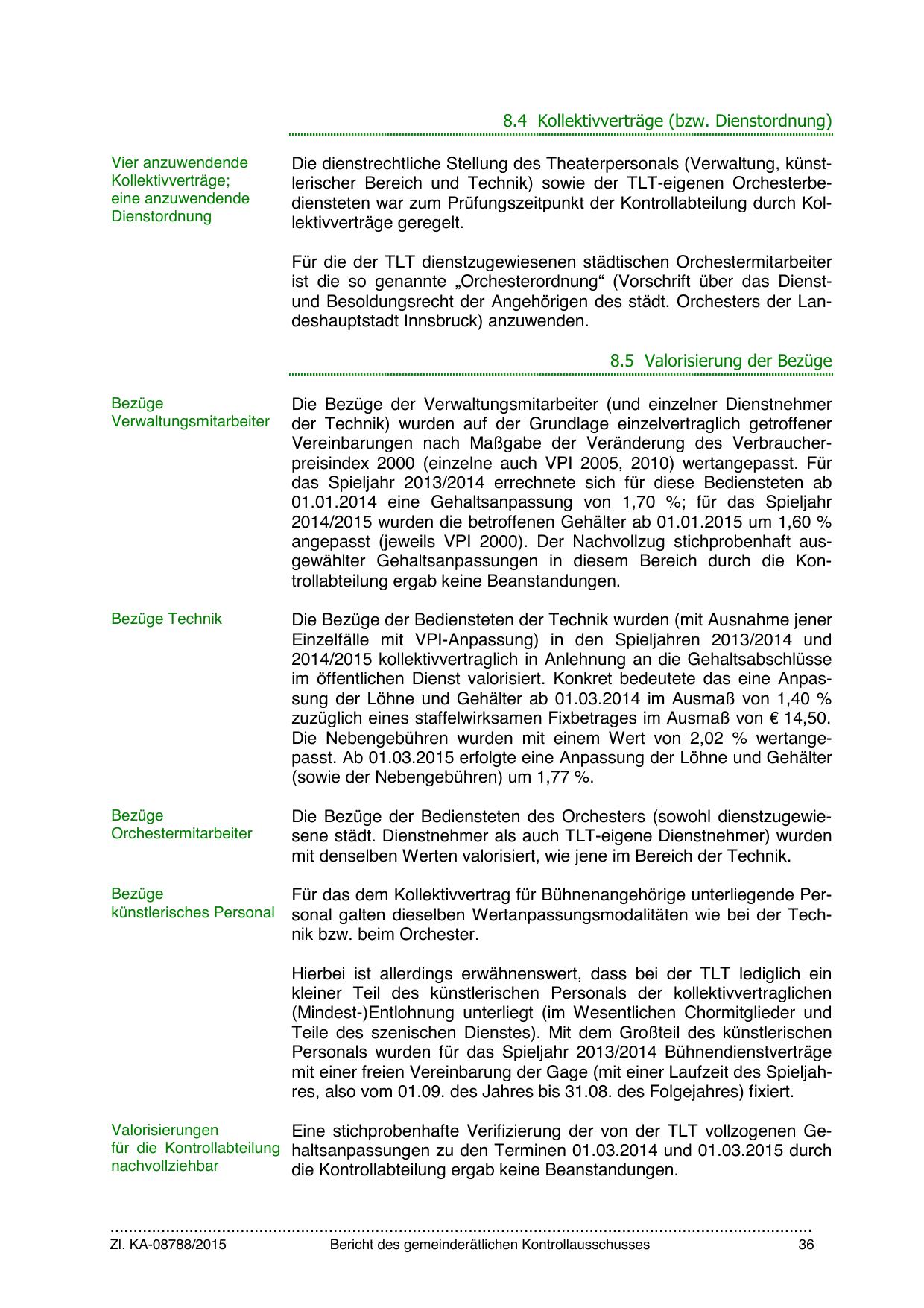 Die dienstrechtliche Stellung des Theaterpersonals (Verwaltung, künstlerischer Bereich und Technik) sowie der TLT-eigenen Orchesterbediensteten war zum Prüfungszeitpunkt der Kontrollabteilung durch Kollektivverträge geregelt.