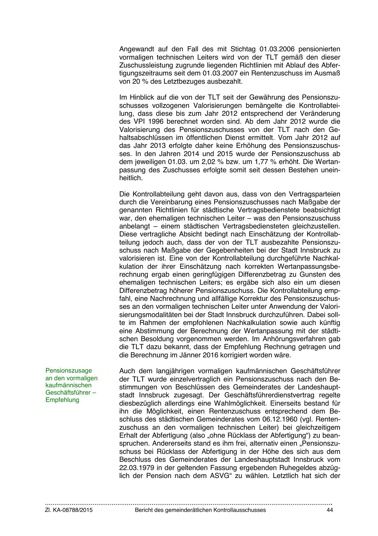 Differenzbetrag höherer Pensionszuschuss. Die Kontrollabteilung empfahl, eine Nachrechnung und allfällige Korrektur des Pensionszuschusses an den vormaligen technischen Leiter unter Anwendung der Valorisierungsmodalitäten bei der Stadt Innsbruck durchzuführen. Dabei sollte im Rahmen der empfohlenen Nachkalkulation sowie auch künftig