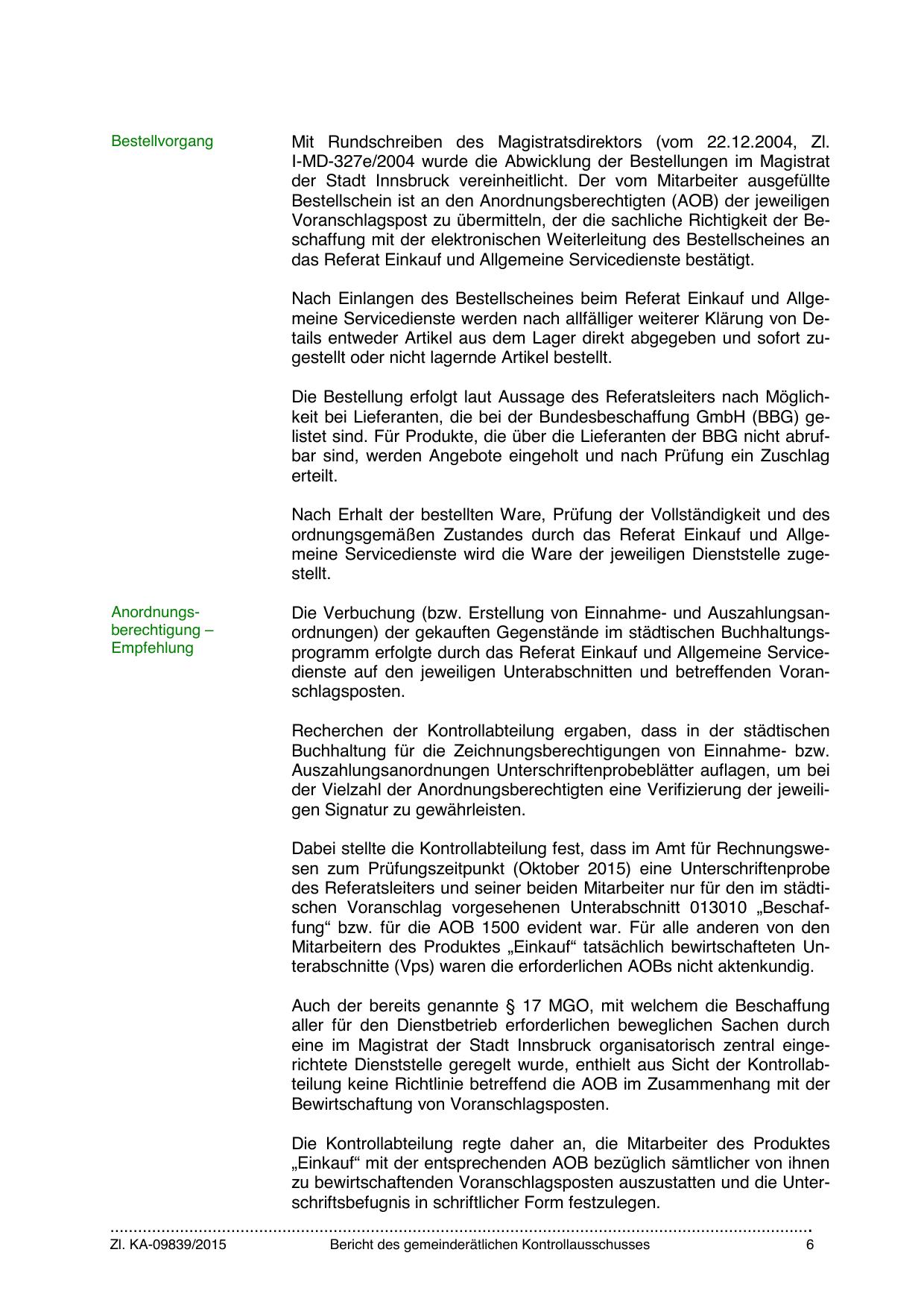 I-MD-327e/2004 wurde die Abwicklung der Bestellungen im Magistrat