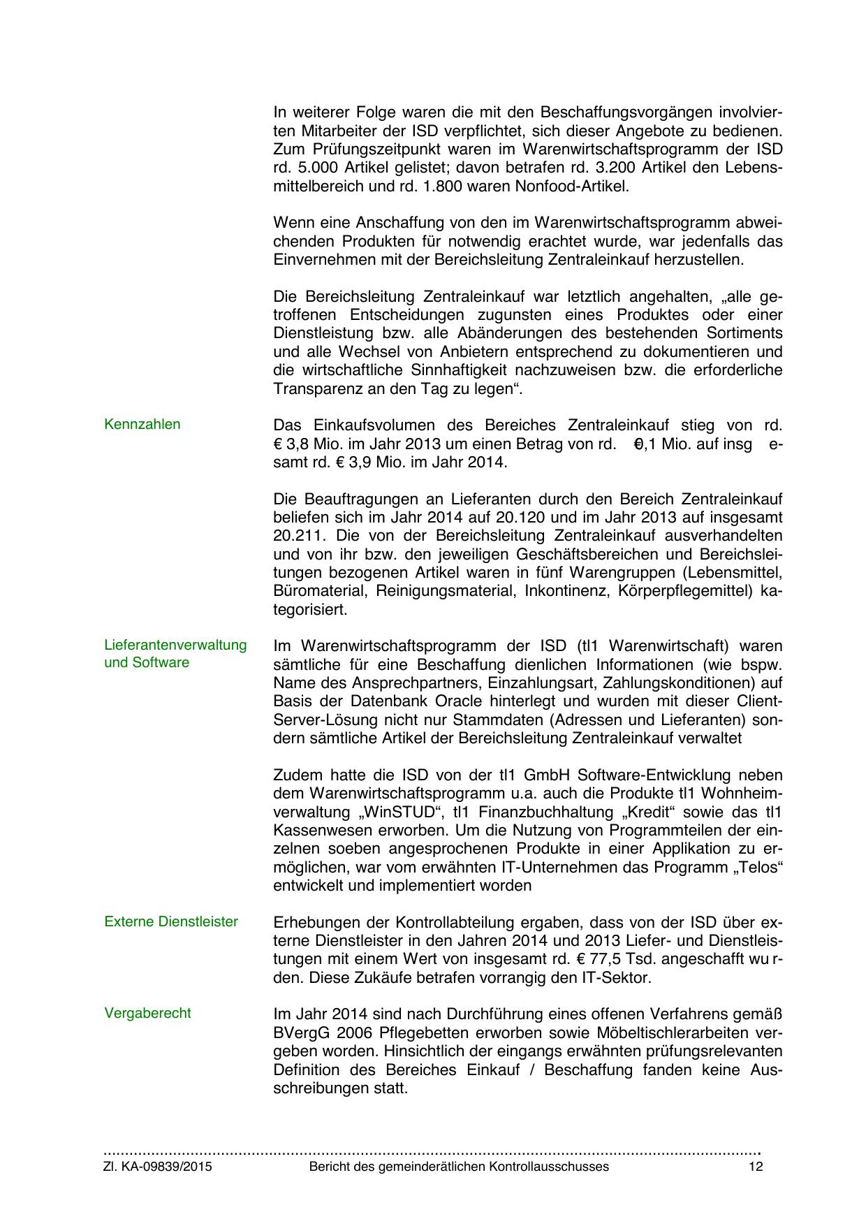 Erhebungen der Kontrollabteilung ergaben, dass von der ISD über externe Dienstleister in den Jahren 2014 und 2013 Liefer- und Dienstleistungen mit einem Wert von insgesamt rd. € 77,5 Tsd. angeschafft wu rden. Diese Zukäufe betrafen vorrangig den IT-Sektor.